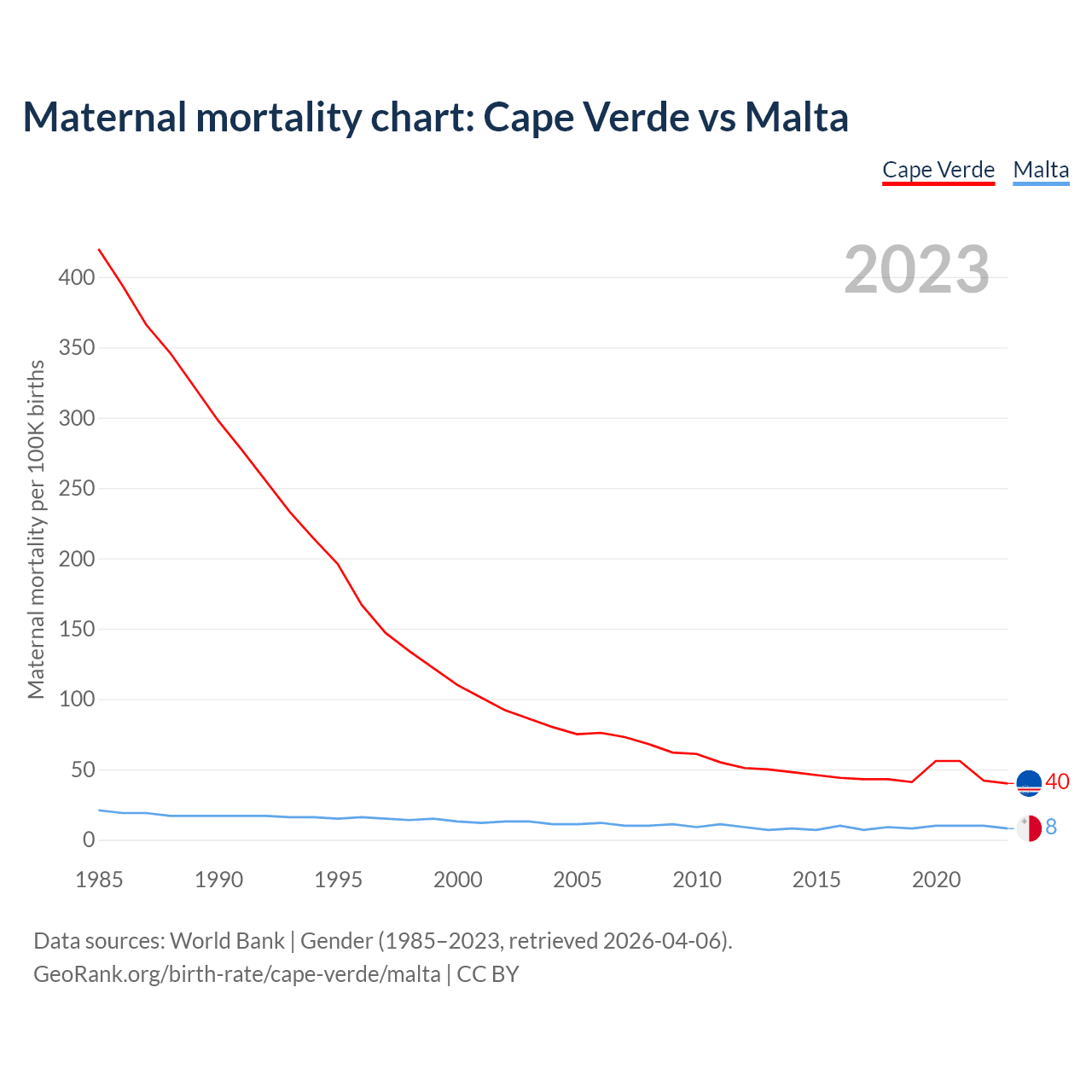 The maternal mortality rate, which is the probability of dying during childbirth or within 42 days of pregnancy termination, is 40 deaths per 100,000 live births in Cape Verde, compared to 8 deaths in Malta.