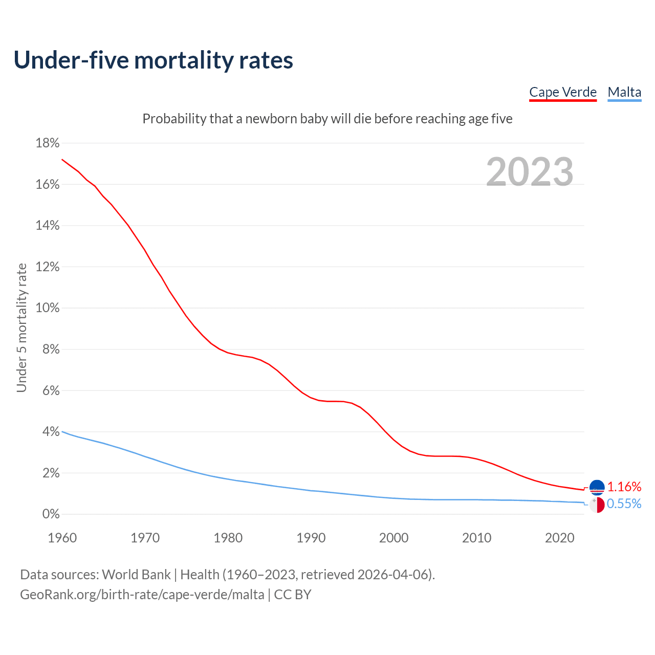 The chance that a newborn baby will die before reaching age five is 1.16% in Cape Verde and 0.55% in Malta. Above is a chart with historical data on under-five mortality rates.