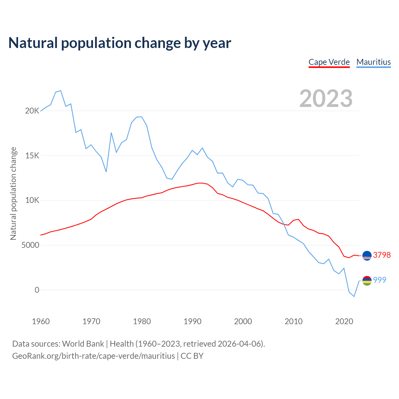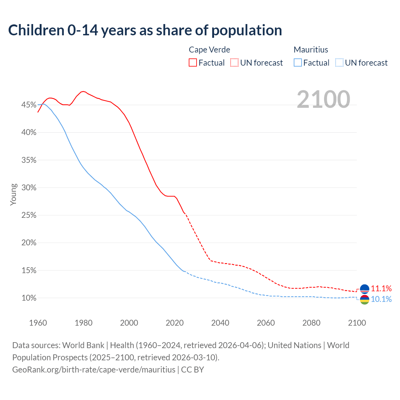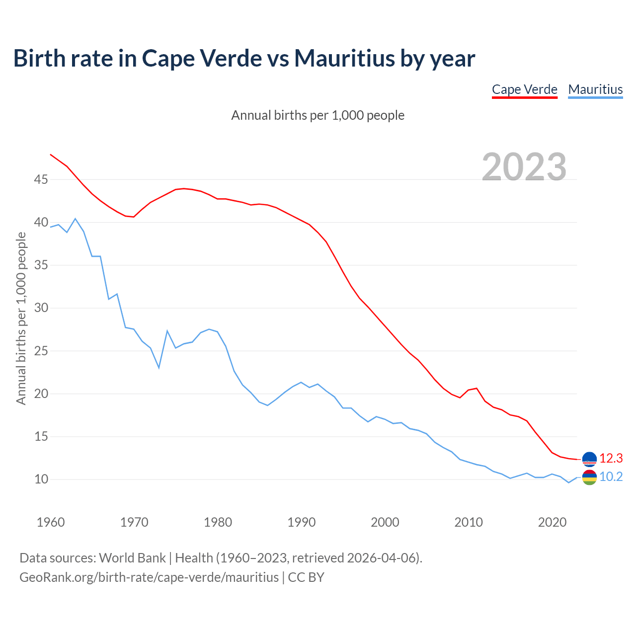 According to the latest available data on birth rates, the fertility rate in Cape Verde was 1.52 children per woman in 2023, compared to 1.39 in Mauritius in 2023. The replacement level is considered to be 2.1 children per woman.