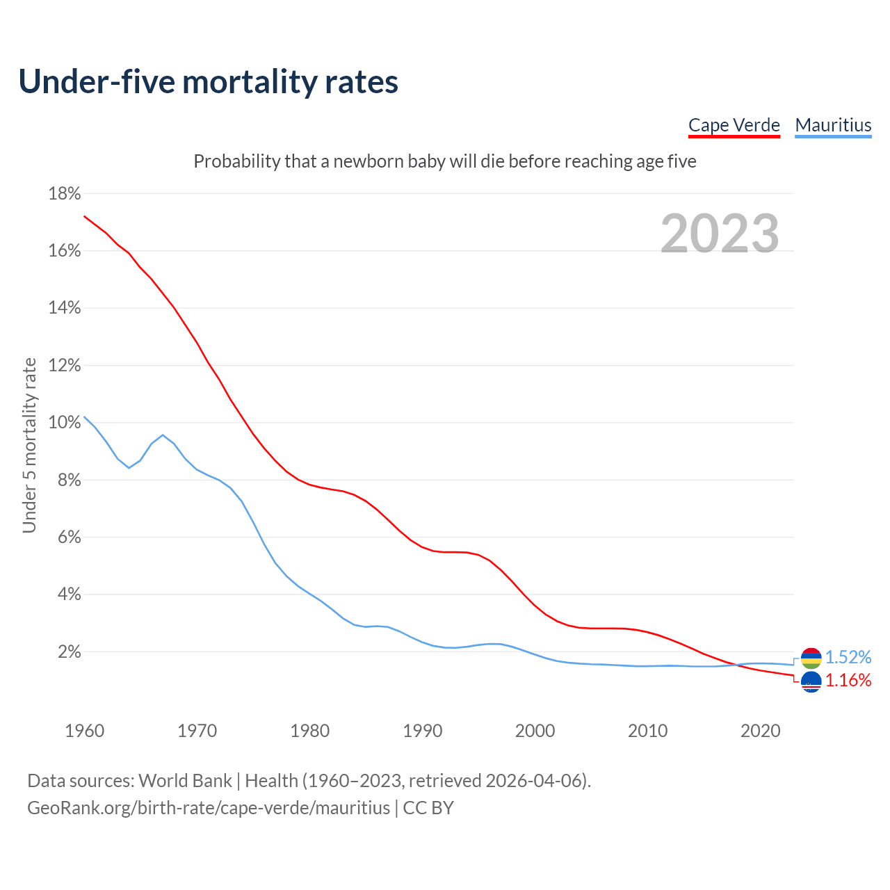 The chance that a newborn baby will die before reaching age five is 1.16% in Cape Verde and 1.52% in Mauritius. Above is a chart with historical data on under-five mortality rates.