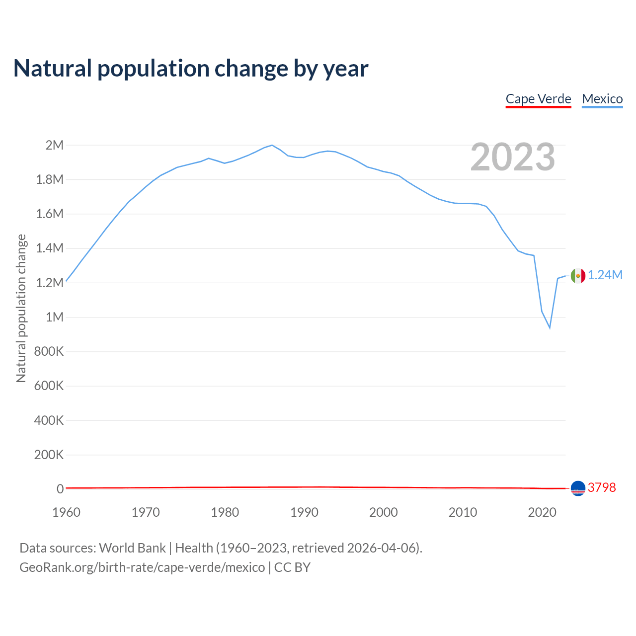 According to the latest available data on birth rates, the fertility rate in Cape Verde was 1.52 children per woman in 2023, compared to 1.91 in Mexico in 2023. The replacement level is considered to be 2.1 children per woman.