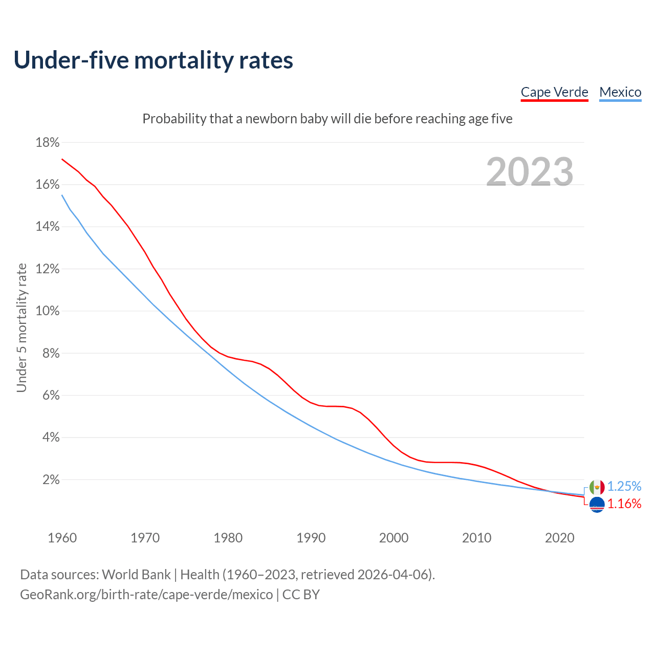 The chance that a newborn baby will die before reaching age five is 1.16% in Cape Verde and 1.25% in Mexico. Above is a chart with historical data on under-five mortality rates.