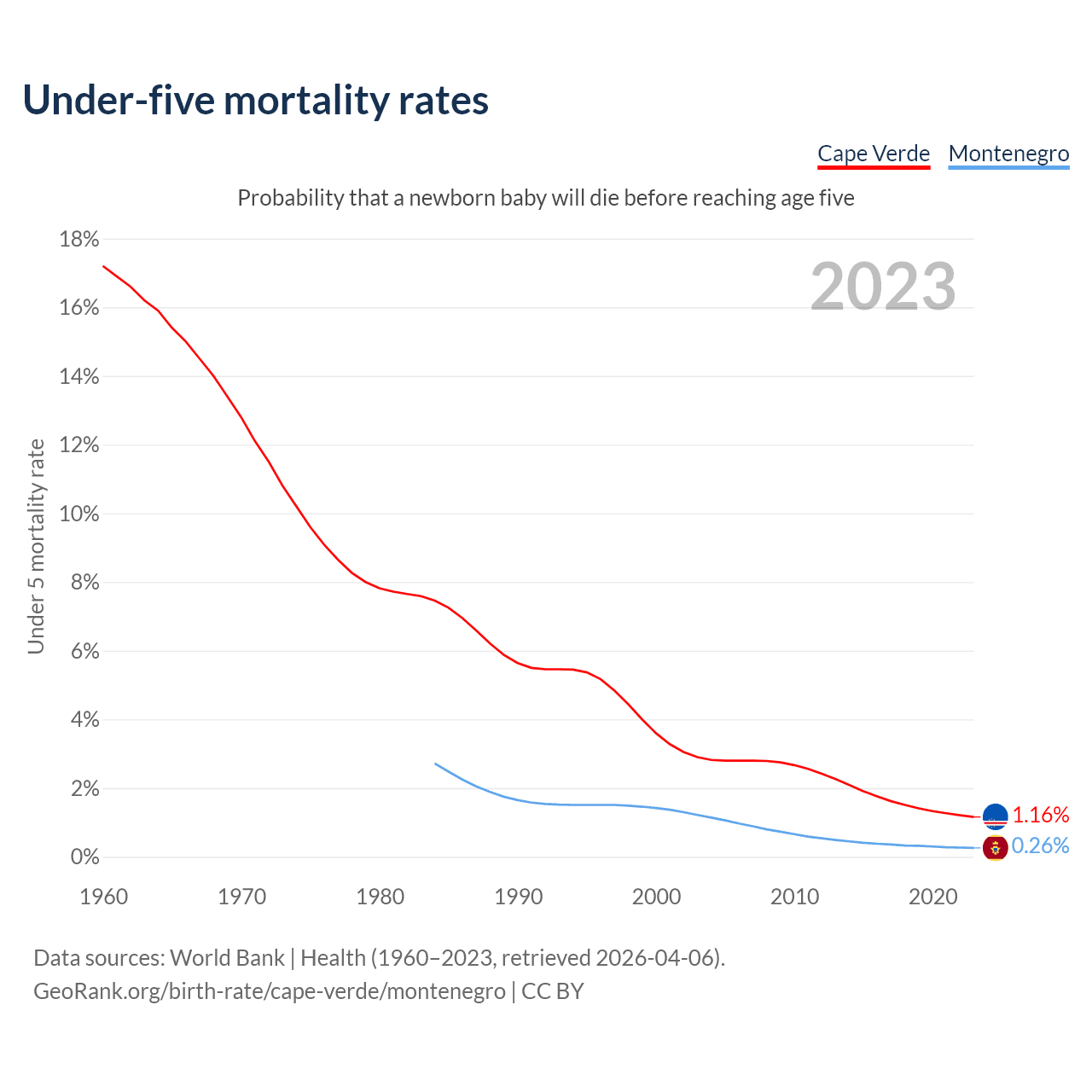 The chance that a newborn baby will die before reaching age five is 1.16% in Cape Verde and 0.26% in Montenegro. Above is a chart with historical data on under-five mortality rates.