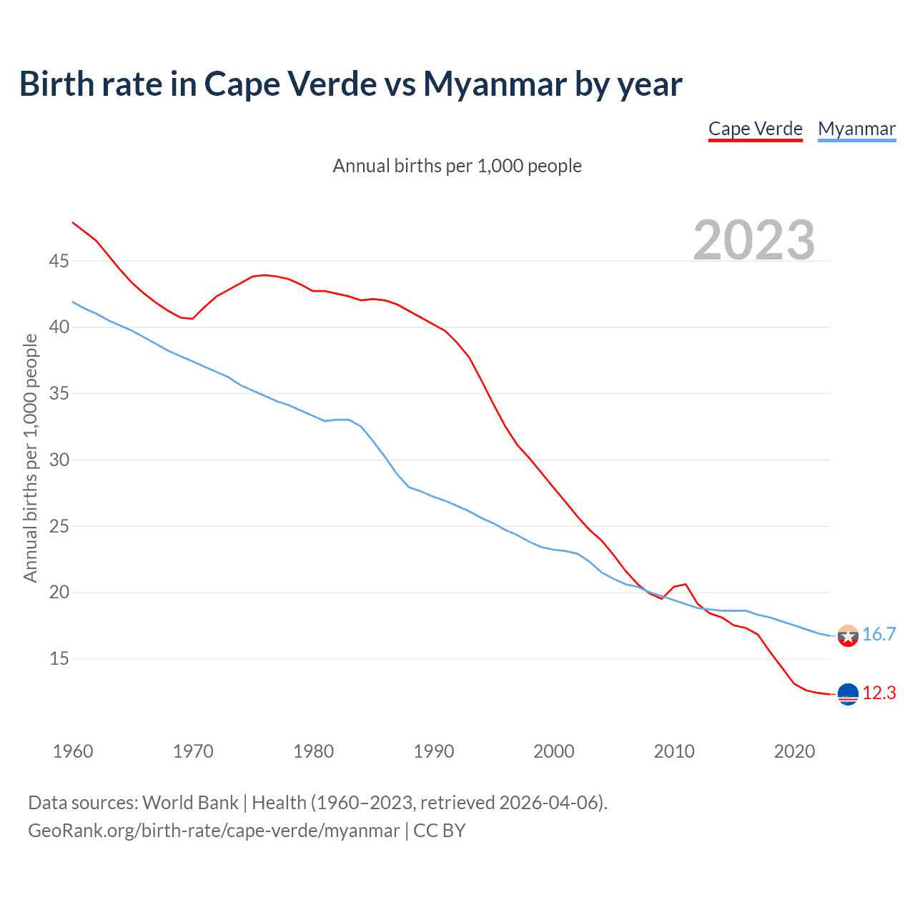 Cape Verde has an annual birth rate of 12.3 births per 1,000 people, compared to 16.7 for Myanmar. The average number of children a woman is expected to have during her lifetime — the fertility rate, is 1.52 in Cape Verde and 2.12 in Myanmar — 39% difference.