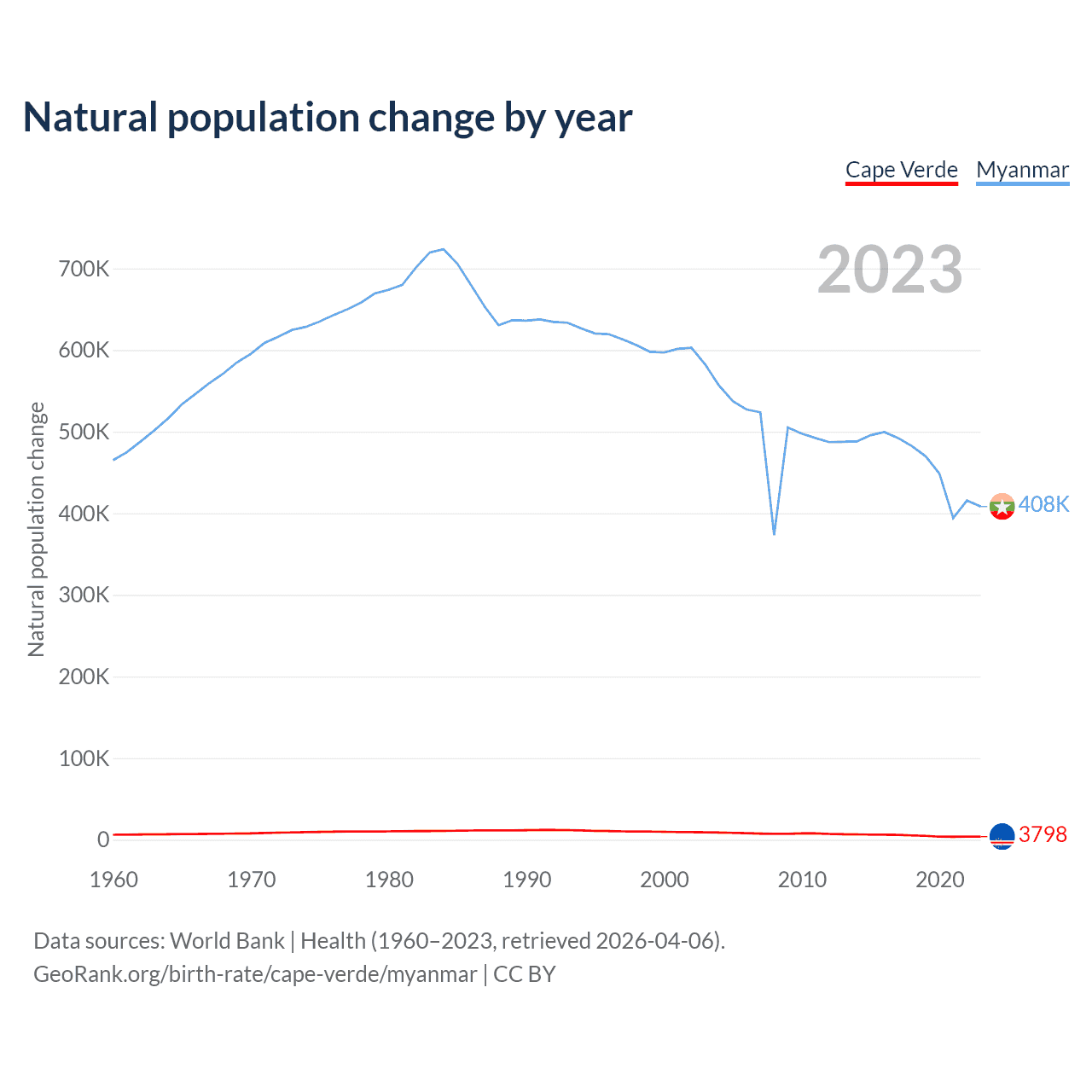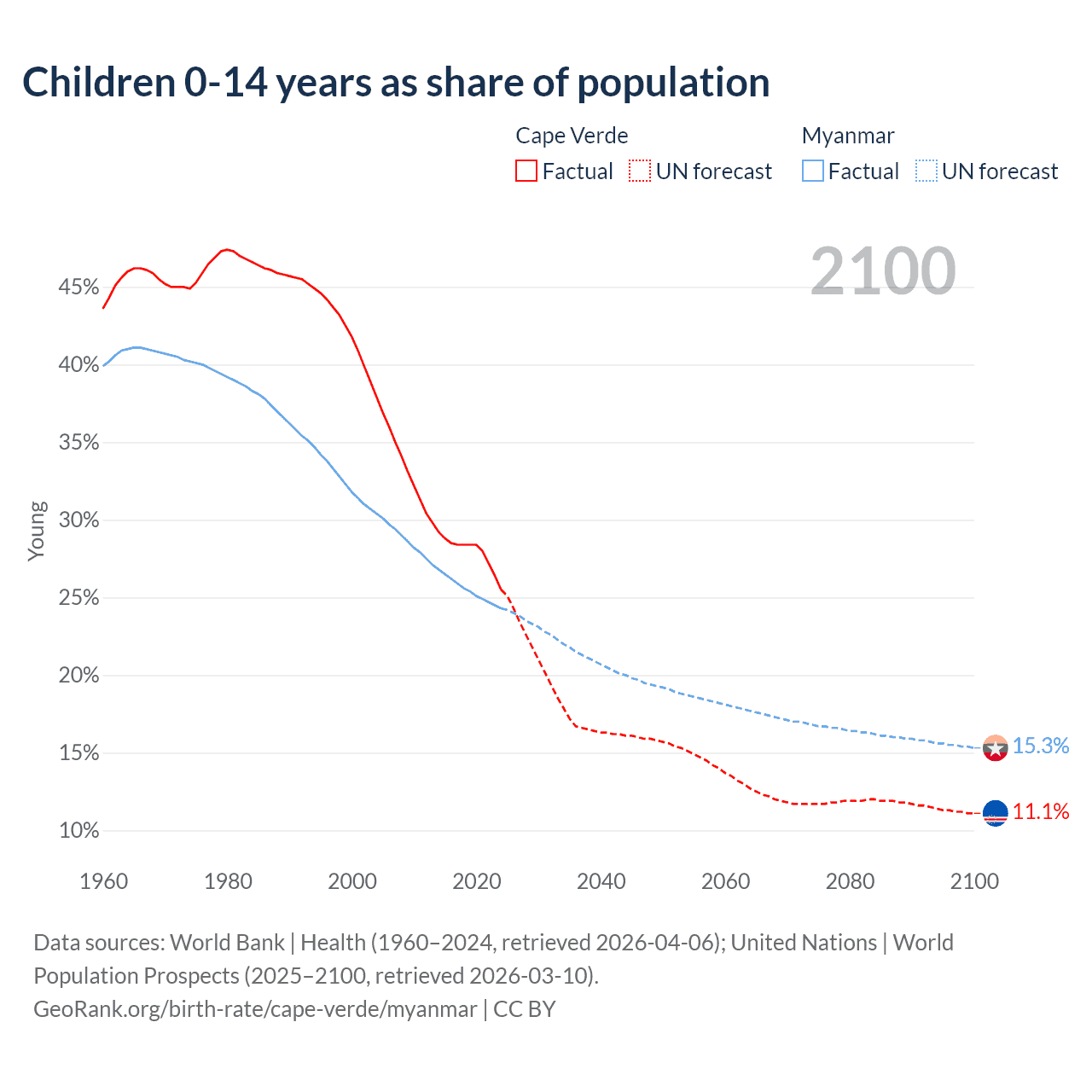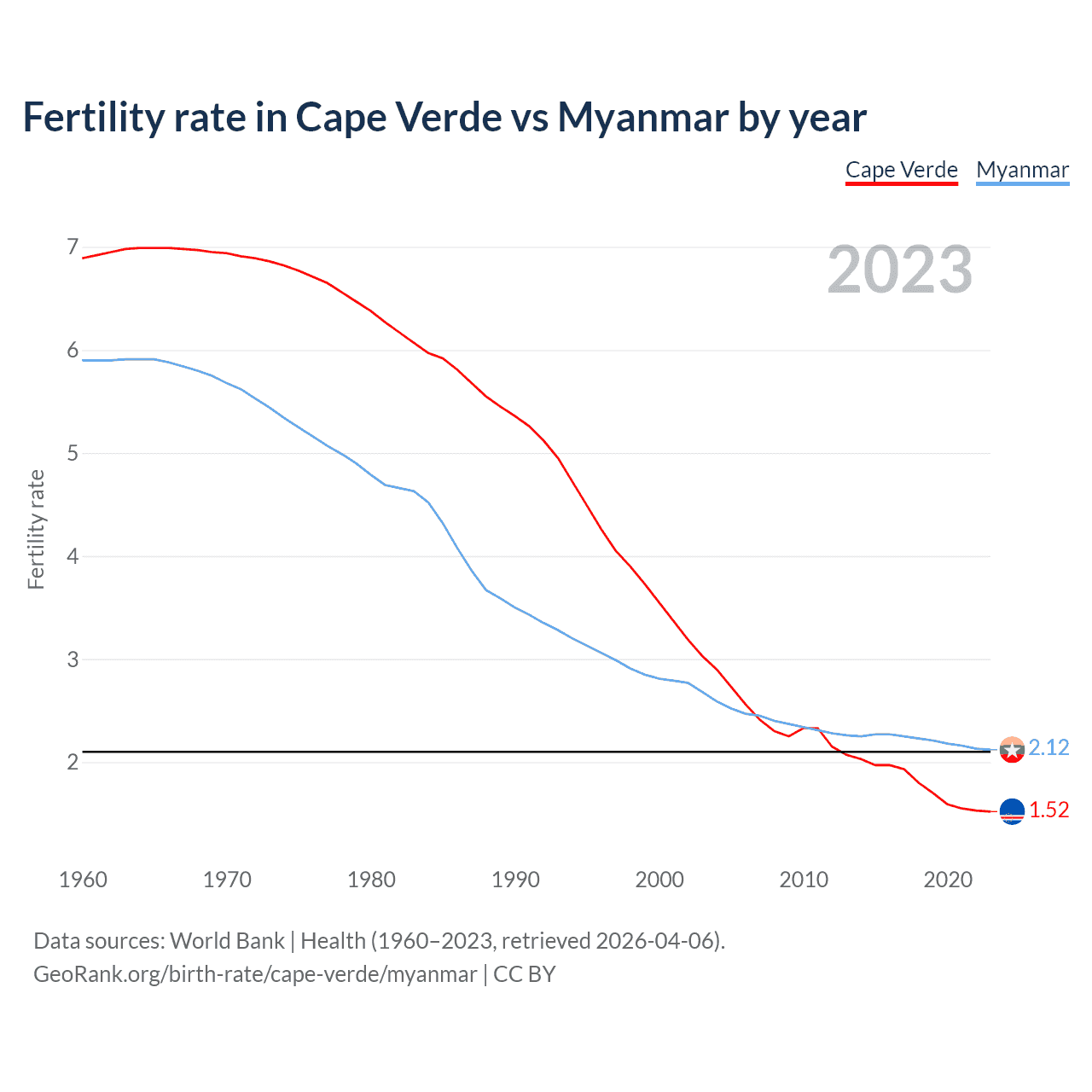 According to the latest available data on birth rates, the fertility rate in Cape Verde was 1.52 children per woman in 2023, compared to 2.12 in Myanmar in 2023. The replacement level is considered to be 2.1 children per woman.