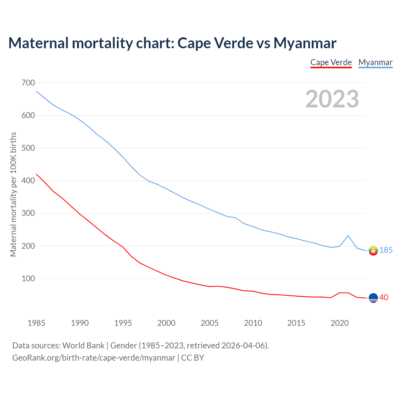 The maternal mortality rate, which is the probability of dying during childbirth or within 42 days of pregnancy termination, is 40 deaths per 100,000 live births in Cape Verde, compared to 185 deaths in Myanmar.