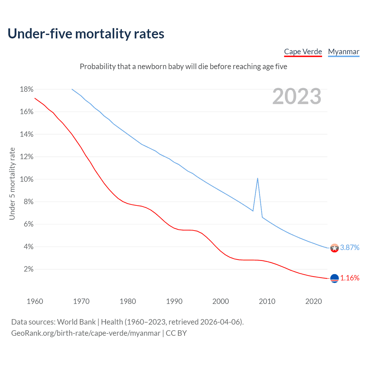 The chance that a newborn baby will die before reaching age five is 1.16% in Cape Verde and 3.87% in Myanmar. Above is a chart with historical data on under-five mortality rates.