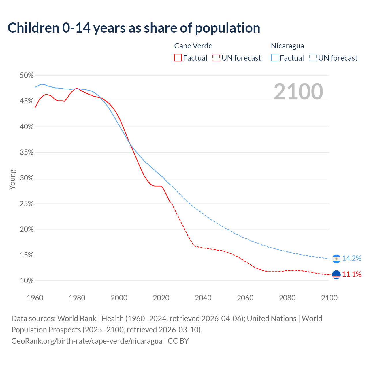 According to the latest available data on birth rates, the fertility rate in Cape Verde was 1.52 children per woman in 2023, compared to 2.22 in Nicaragua in 2023. The replacement level is considered to be 2.1 children per woman.