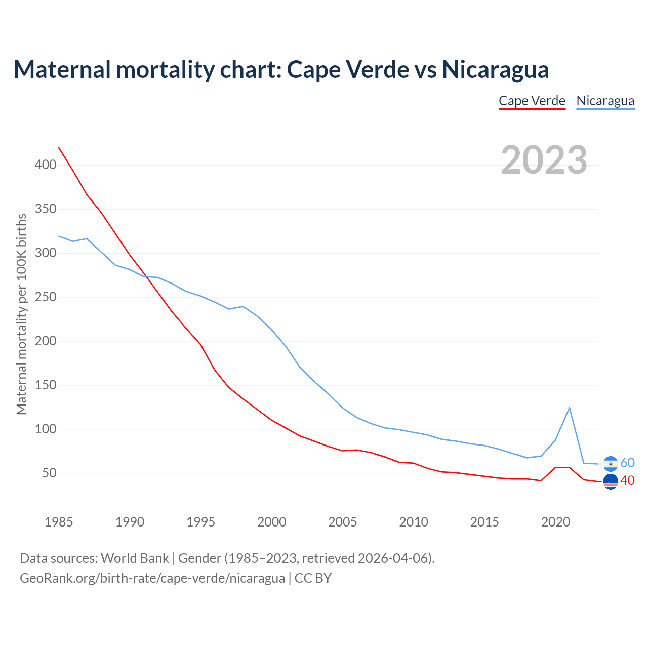 The maternal mortality rate, which is the probability of dying during childbirth or within 42 days of pregnancy termination, is 40 deaths per 100,000 live births in Cape Verde, compared to 60 deaths in Nicaragua.