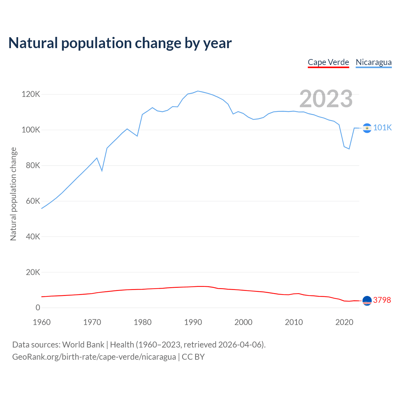 Check Cape Verde vs Nicaragua population clock for a dynamic visualization of the changing population.
