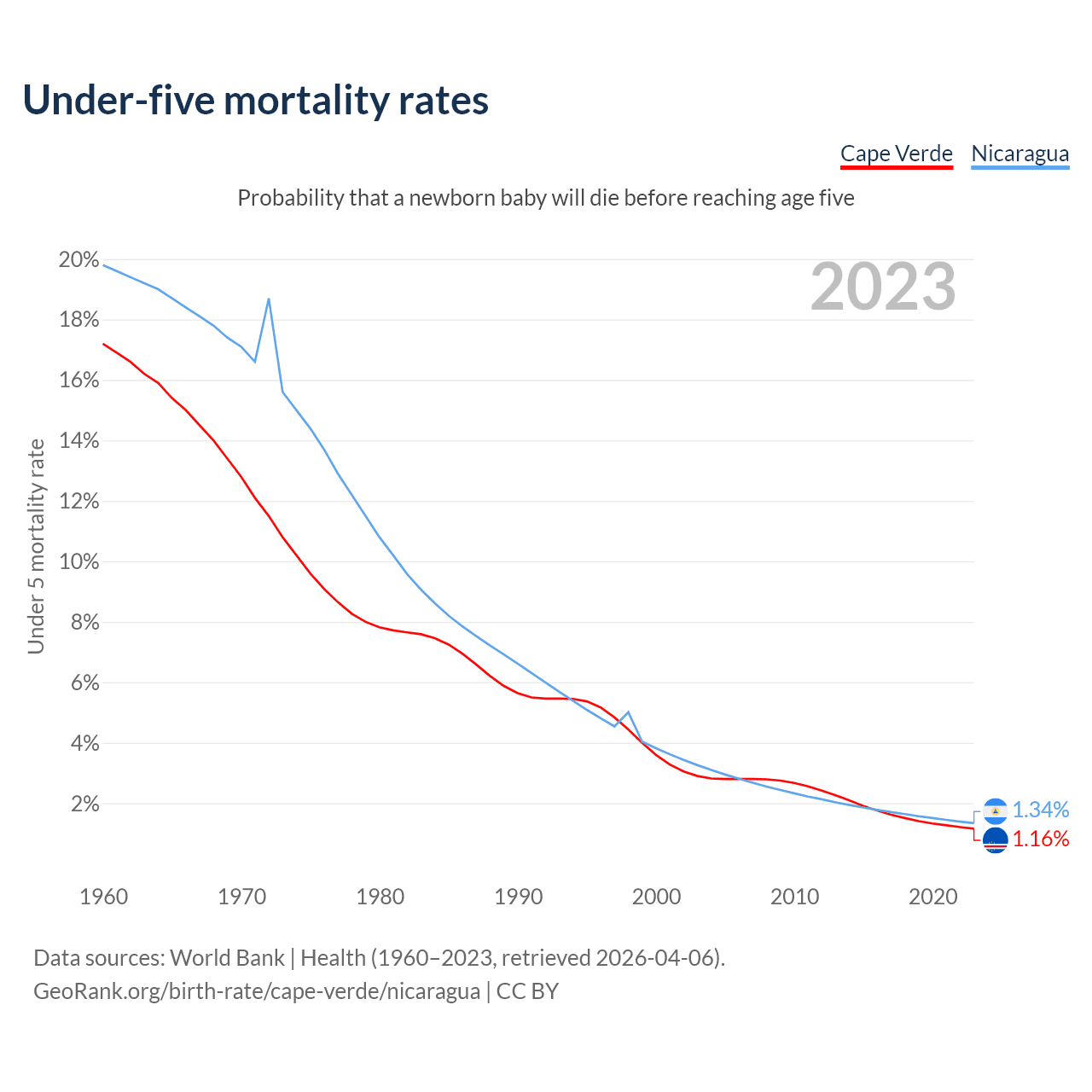 The chance that a newborn baby will die before reaching age five is 1.16% in Cape Verde and 1.34% in Nicaragua. Above is a chart with historical data on under-five mortality rates.