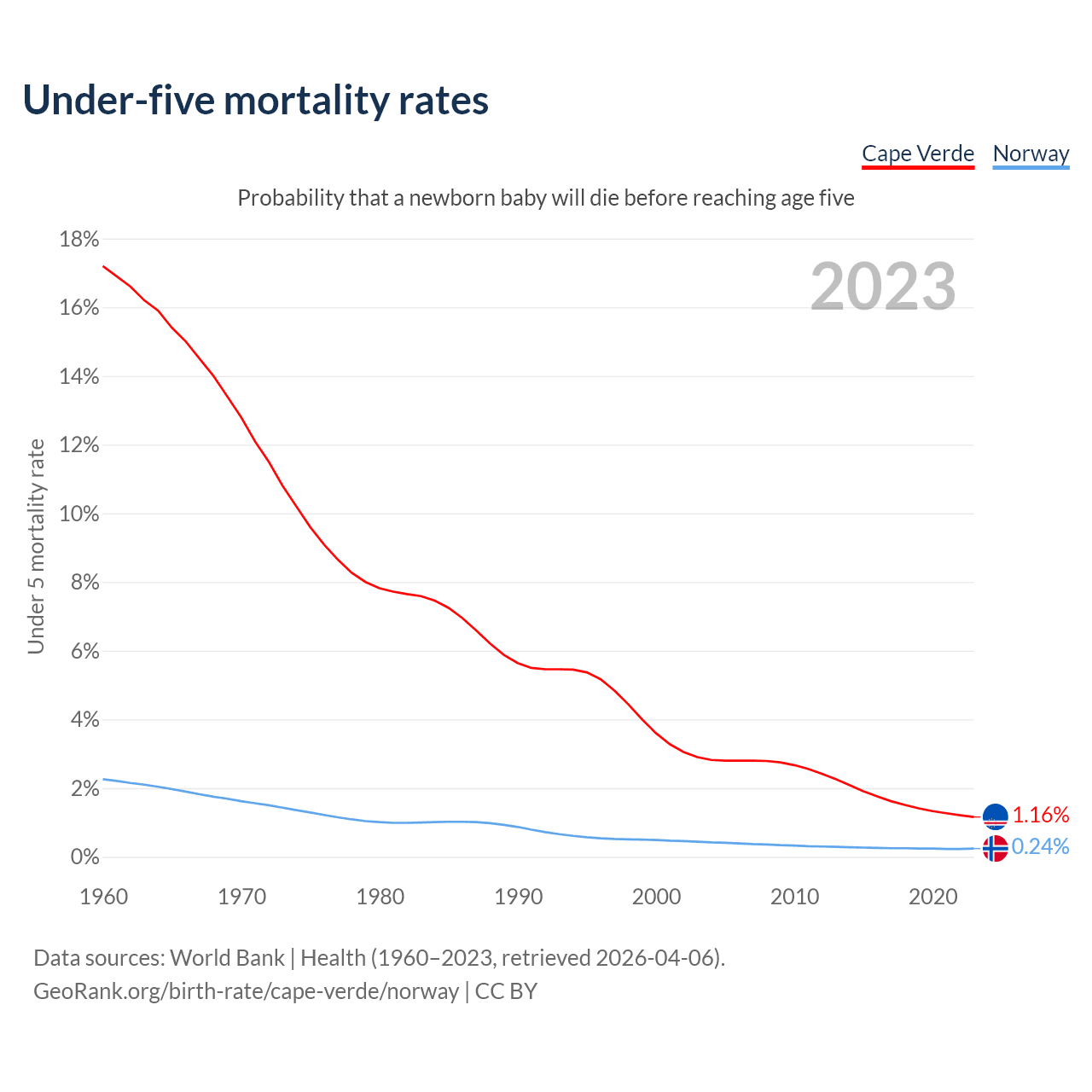The chance that a newborn baby will die before reaching age five is 1.16% in Cape Verde and 0.24% in Norway. Above is a chart with historical data on under-five mortality rates.