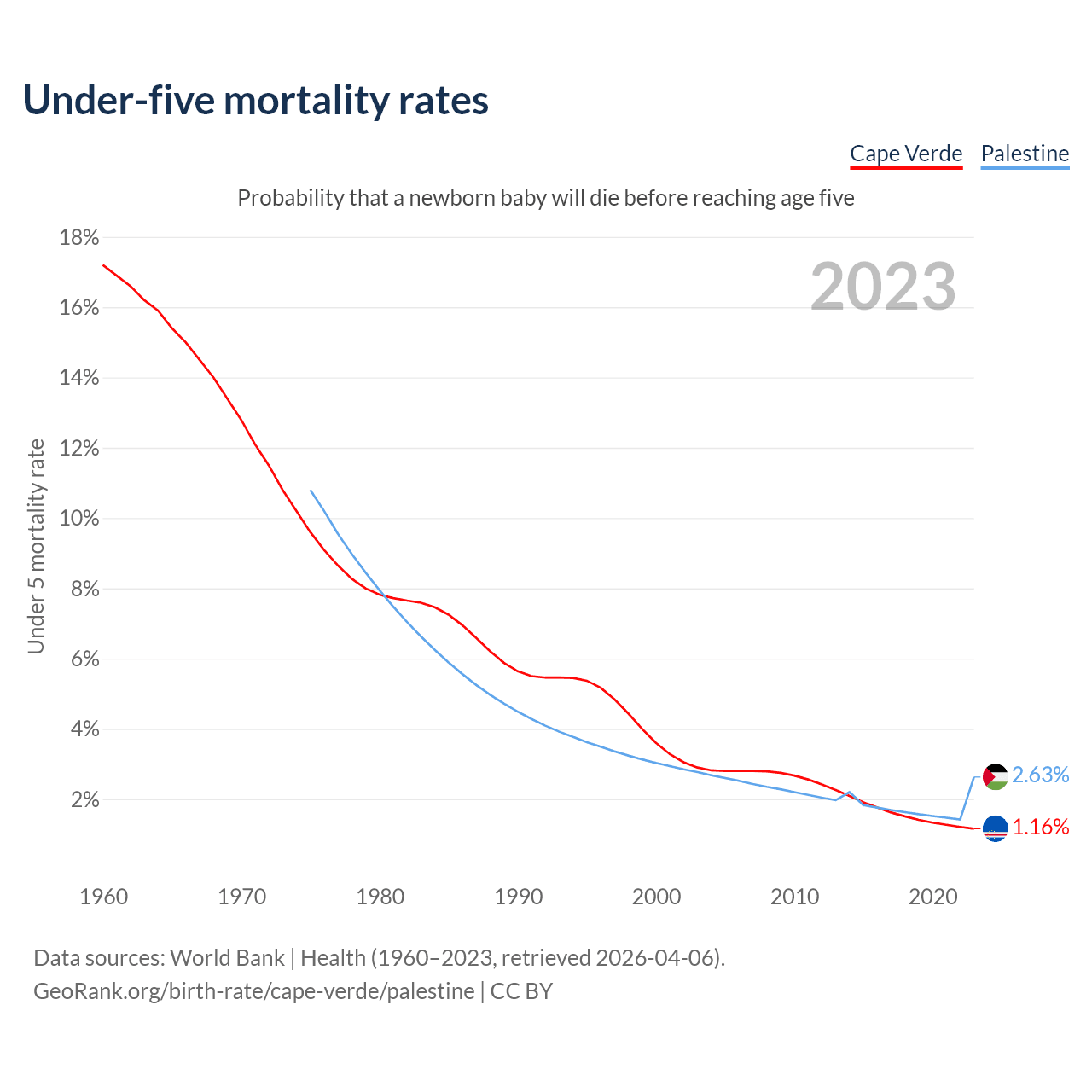 The chance that a newborn baby will die before reaching age five is 1.16% in Cape Verde and 2.63% in Palestine. Above is a chart with historical data on under-five mortality rates.