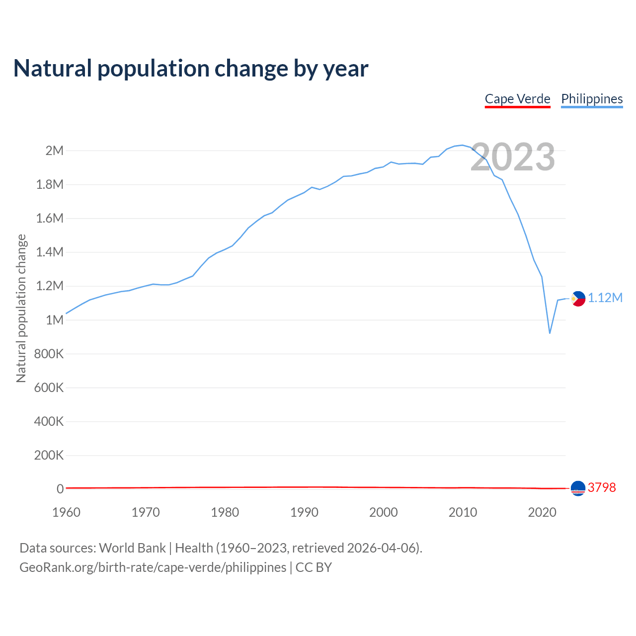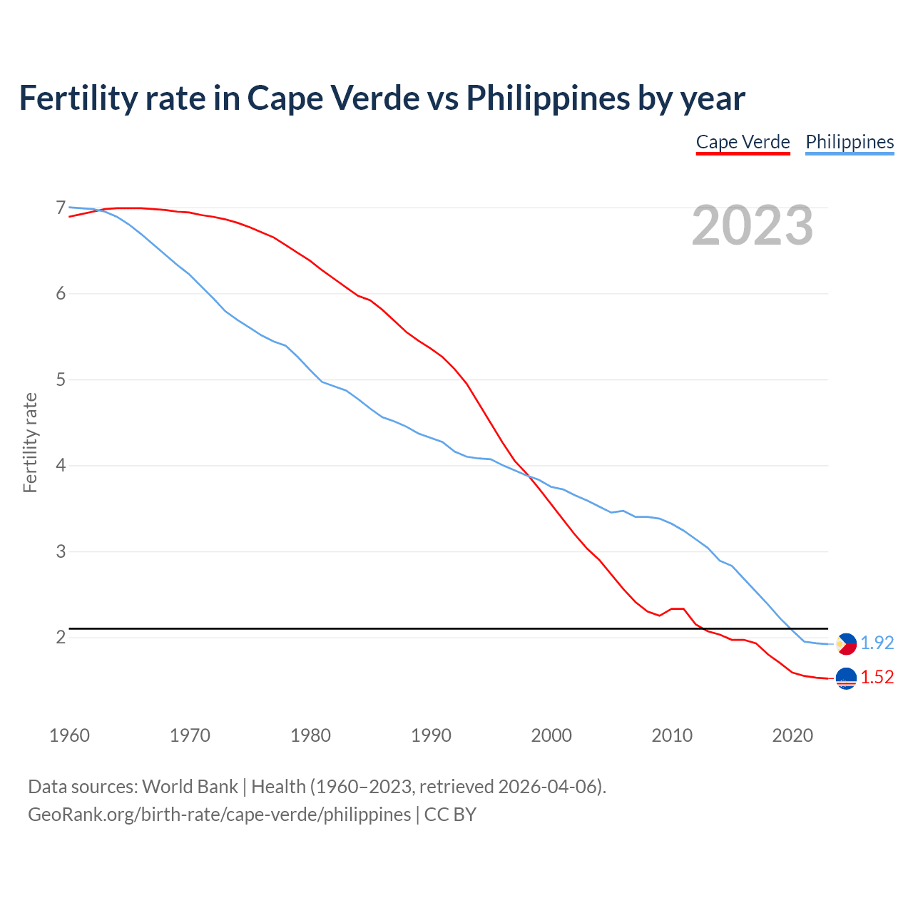 According to the latest available data on birth rates, the fertility rate in Cape Verde was 1.52 children per woman in 2023, compared to 1.92 in the Philippines in 2023. The replacement level is considered to be 2.1 children per woman.