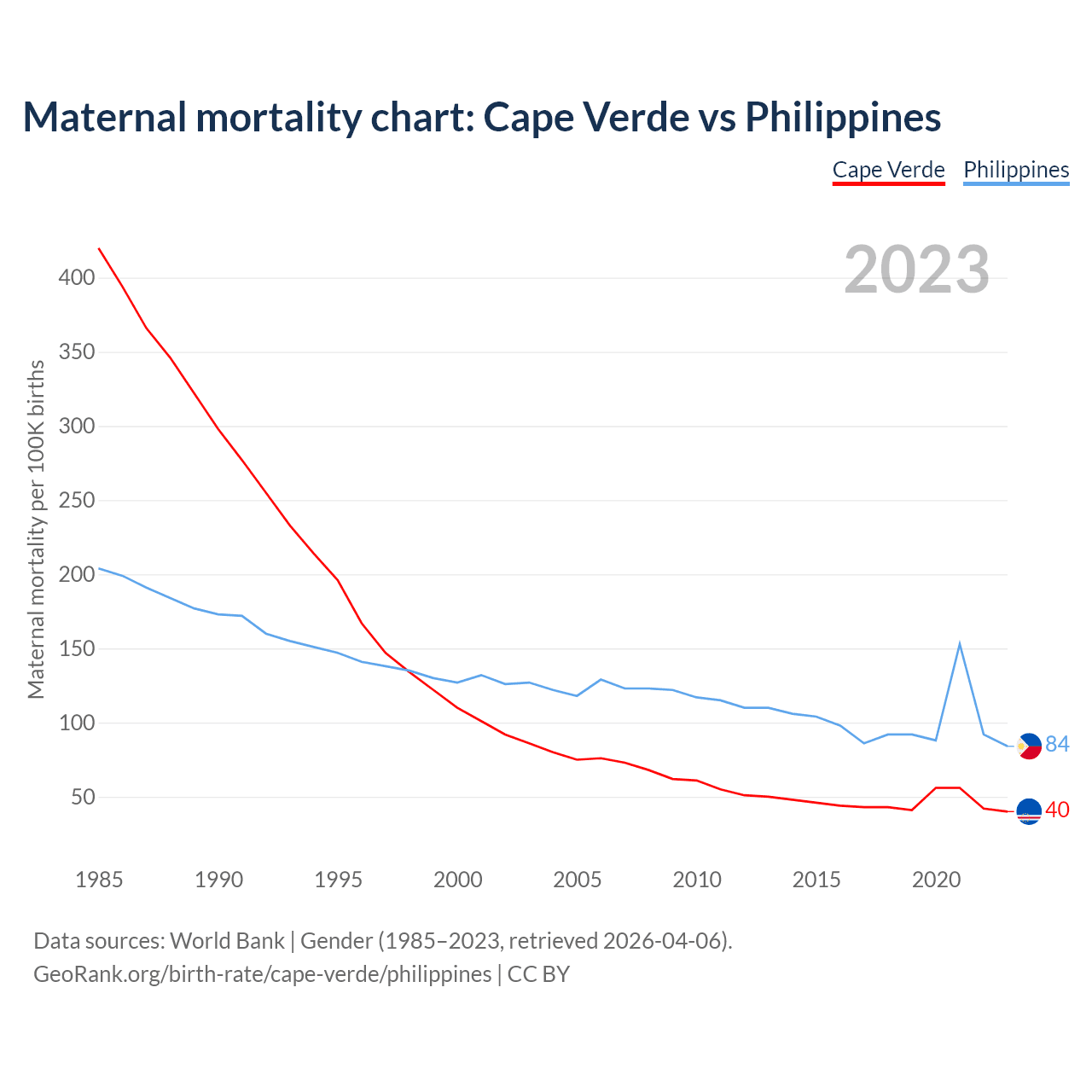 The maternal mortality rate, which is the probability of dying during childbirth or within 42 days of pregnancy termination, is 40 deaths per 100,000 live births in Cape Verde, compared to 84 deaths in the Philippines.