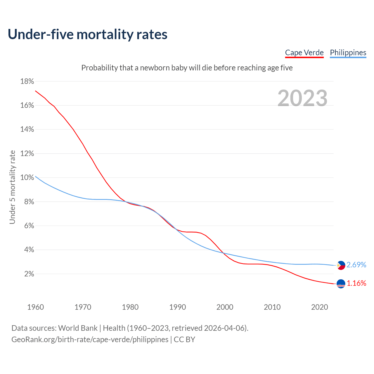 The chance that a newborn baby will die before reaching age five is 1.16% in Cape Verde and 2.69% in the Philippines. Above is a chart with historical data on under-five mortality rates.