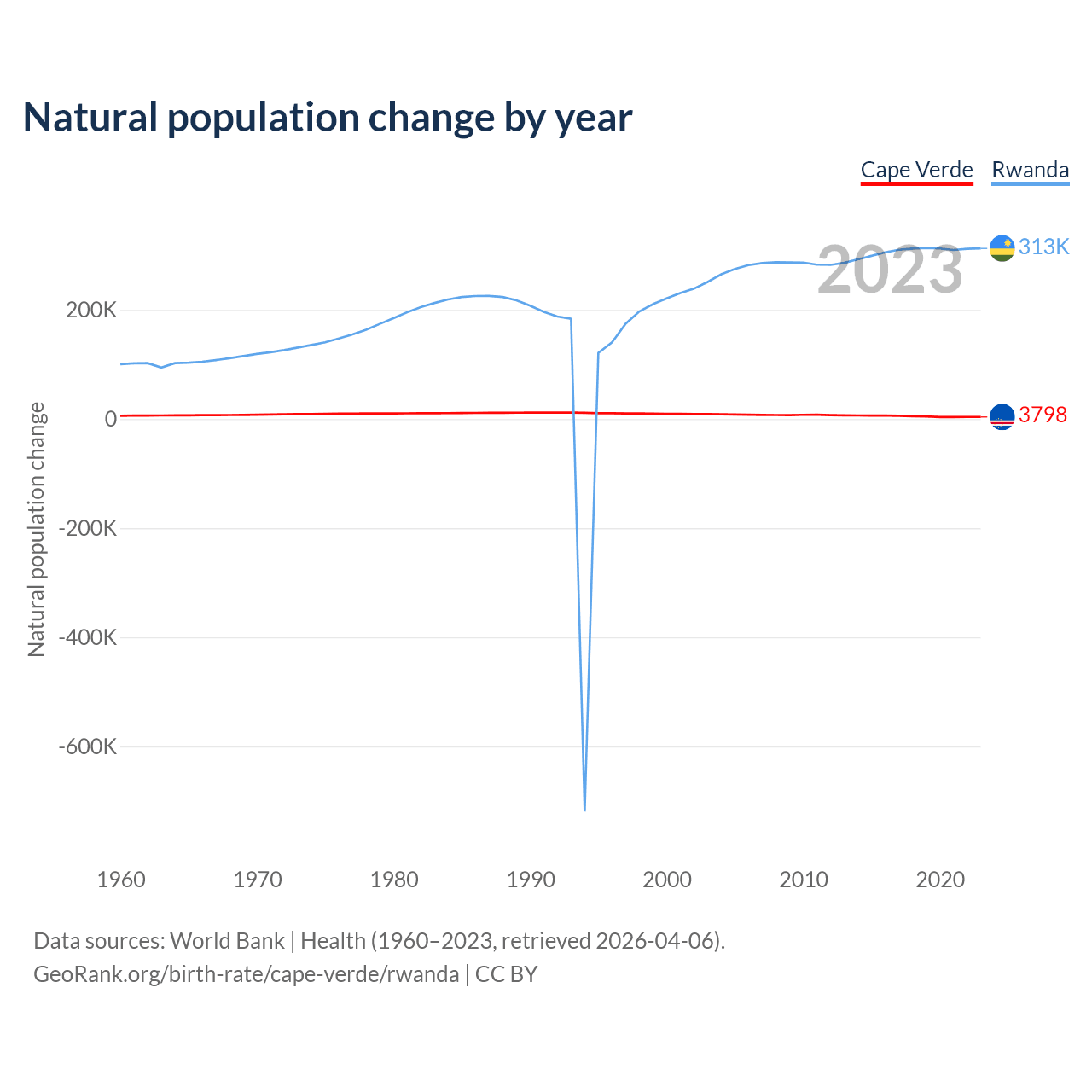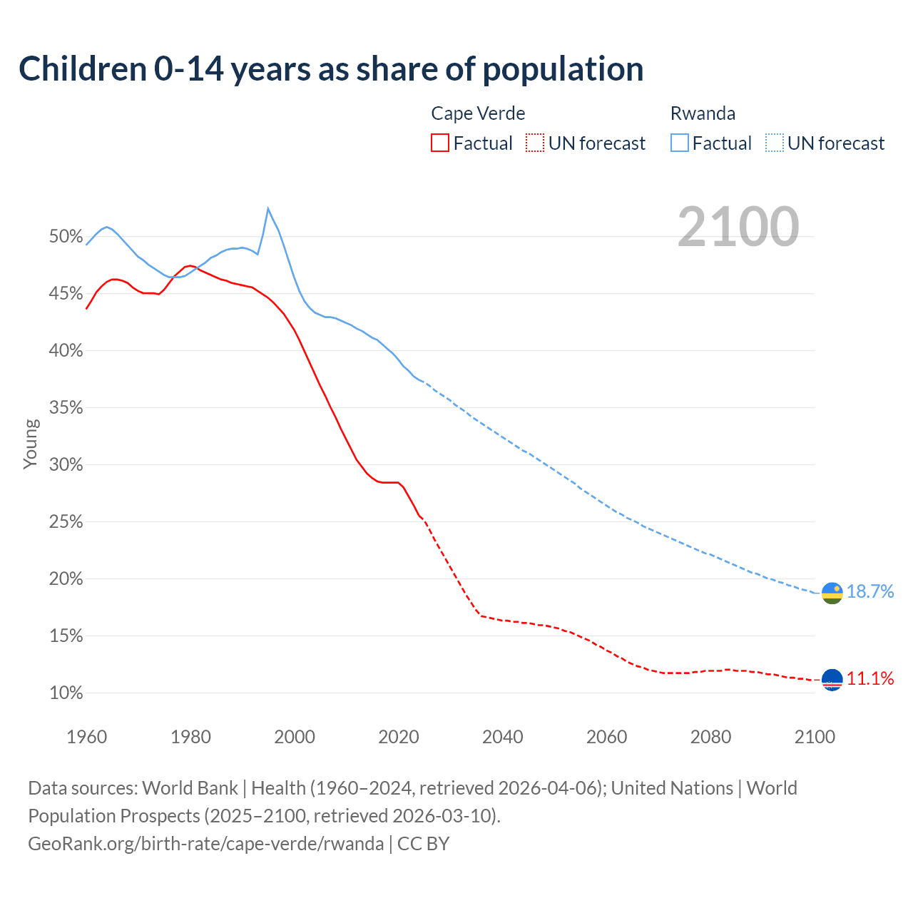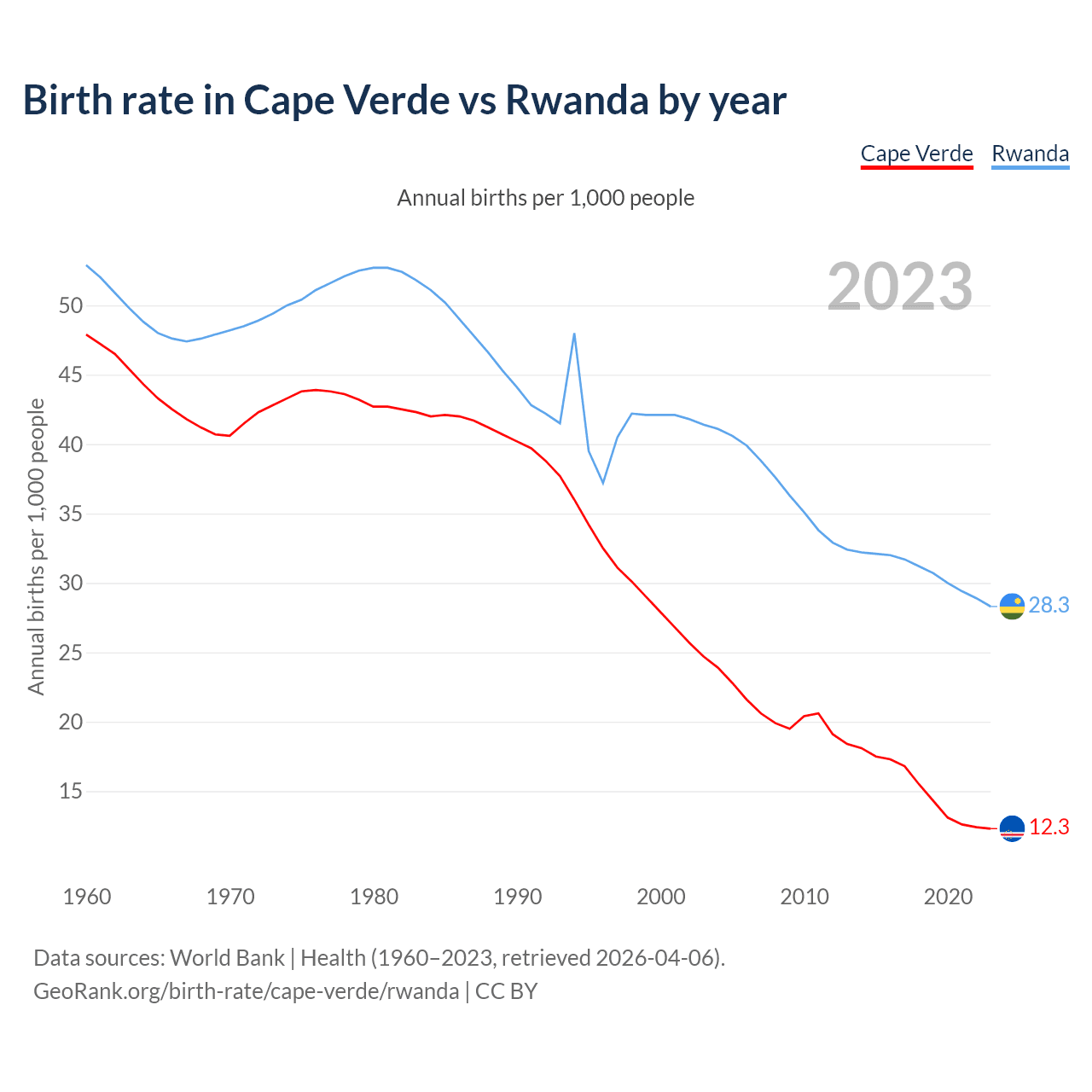Cape Verde has an annual birth rate of 12.3 births per 1,000 people, compared to 28.3 for Rwanda. The average number of children a woman is expected to have during her lifetime — the fertility rate, is 1.52 in Cape Verde and 3.7 in Rwanda — 143% difference.