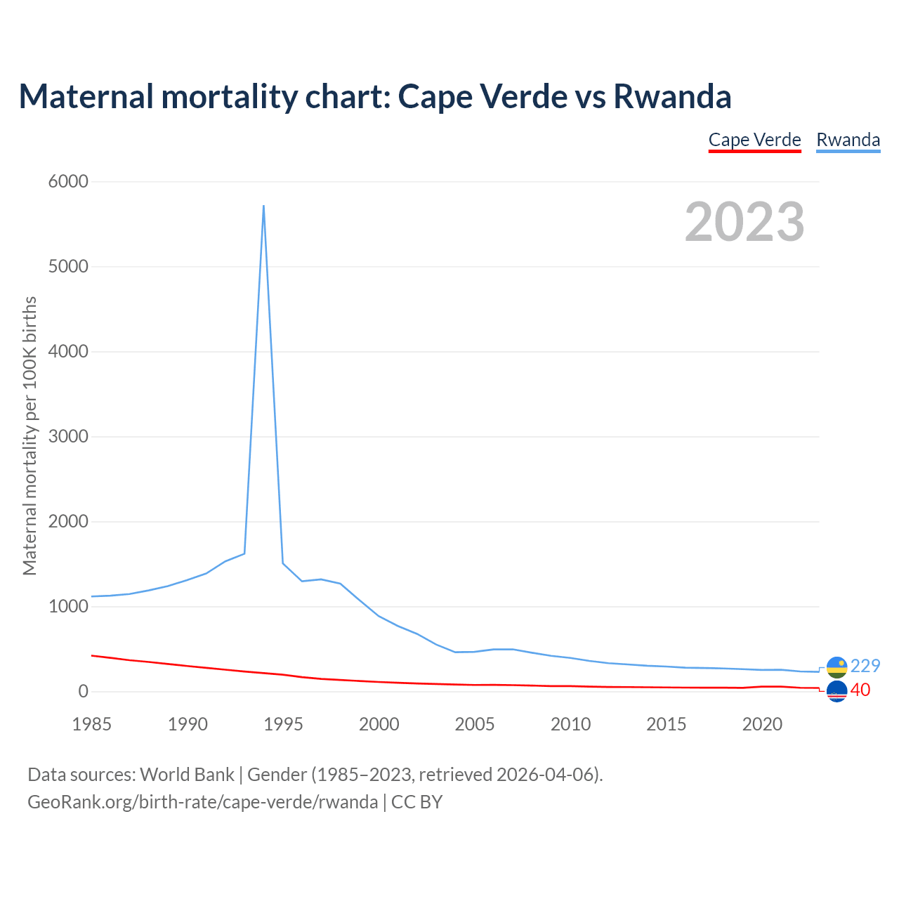 The maternal mortality rate, which is the probability of dying during childbirth or within 42 days of pregnancy termination, is 40 deaths per 100,000 live births in Cape Verde, compared to 229 deaths in Rwanda.