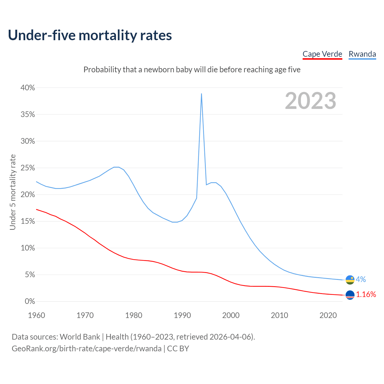 The chance that a newborn baby will die before reaching age five is 1.16% in Cape Verde and 4% in Rwanda. Above is a chart with historical data on under-five mortality rates.