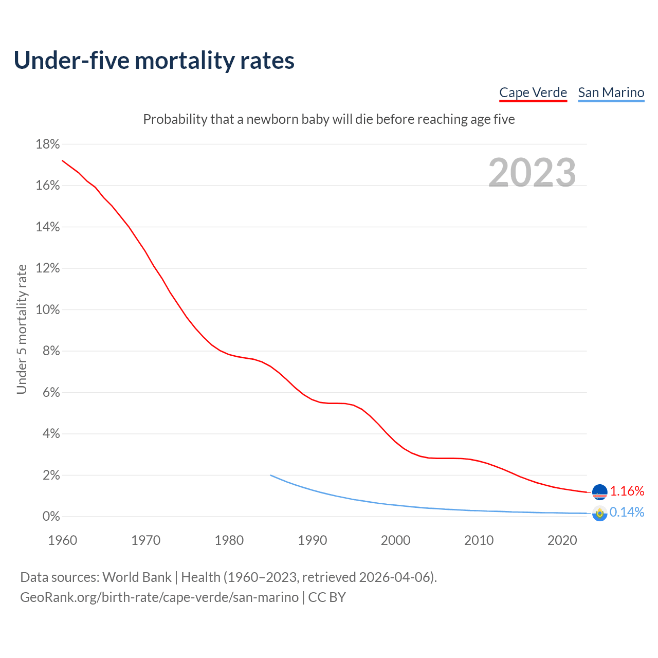 The chance that a newborn baby will die before reaching age five is 1.16% in Cape Verde and 0.14% in San Marino. Above is a chart with historical data on under-five mortality rates.