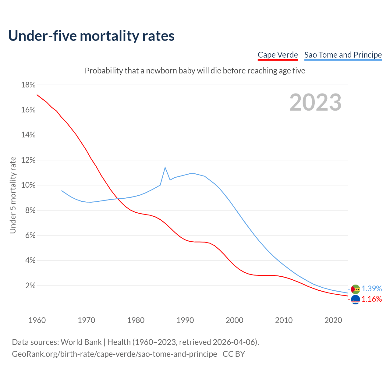 The chance that a newborn baby will die before reaching age five is 1.16% in Cape Verde and 1.39% in Sao Tome and Principe. Above is a chart with historical data on under-five mortality rates.