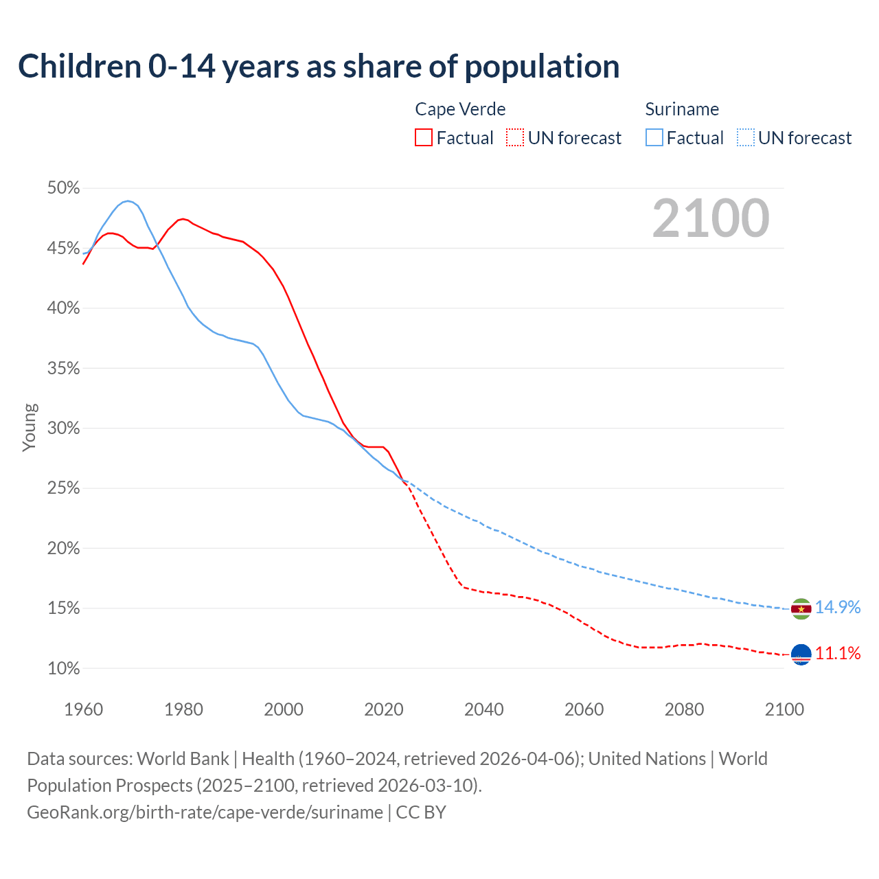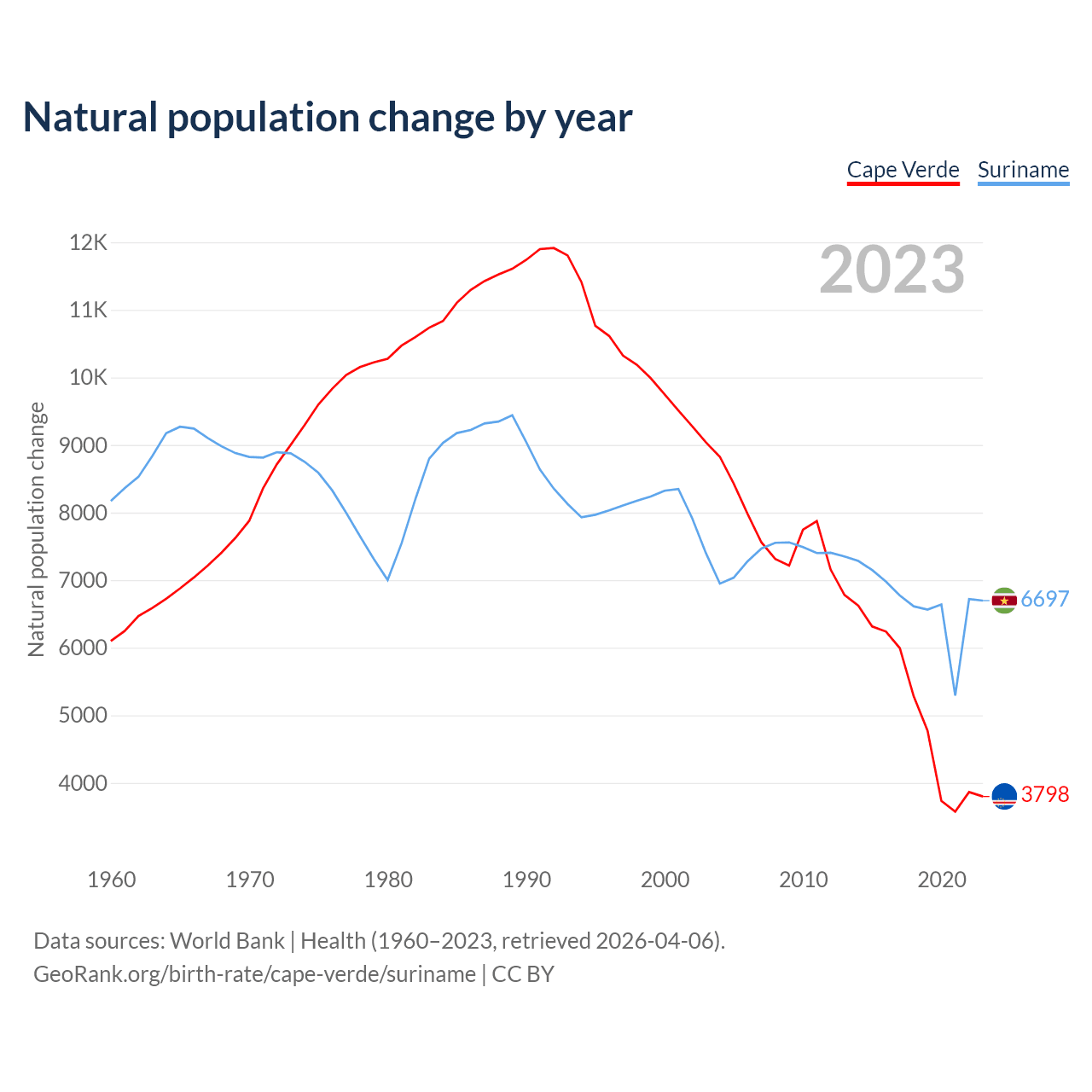 According to the latest available data on birth rates, the fertility rate in Cape Verde was 1.52 children per woman in 2023, compared to 2.25 in Suriname in 2023. The replacement level is considered to be 2.1 children per woman.