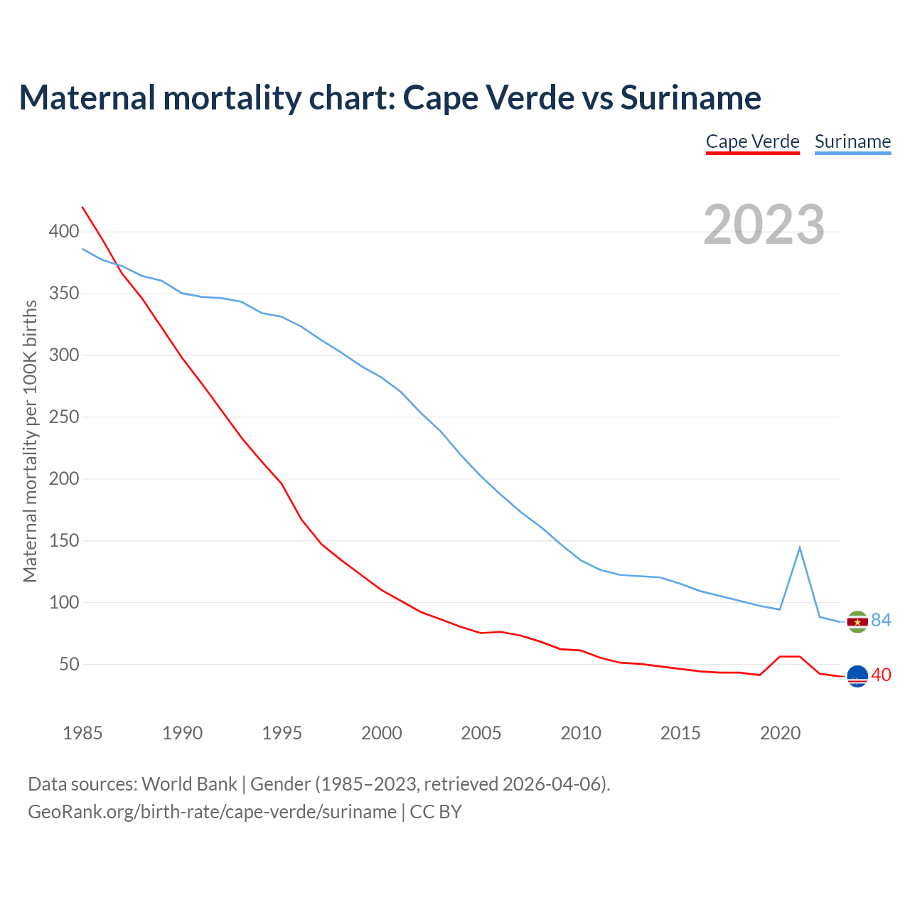 The maternal mortality rate, which is the probability of dying during childbirth or within 42 days of pregnancy termination, is 40 deaths per 100,000 live births in Cape Verde, compared to 84 deaths in Suriname.