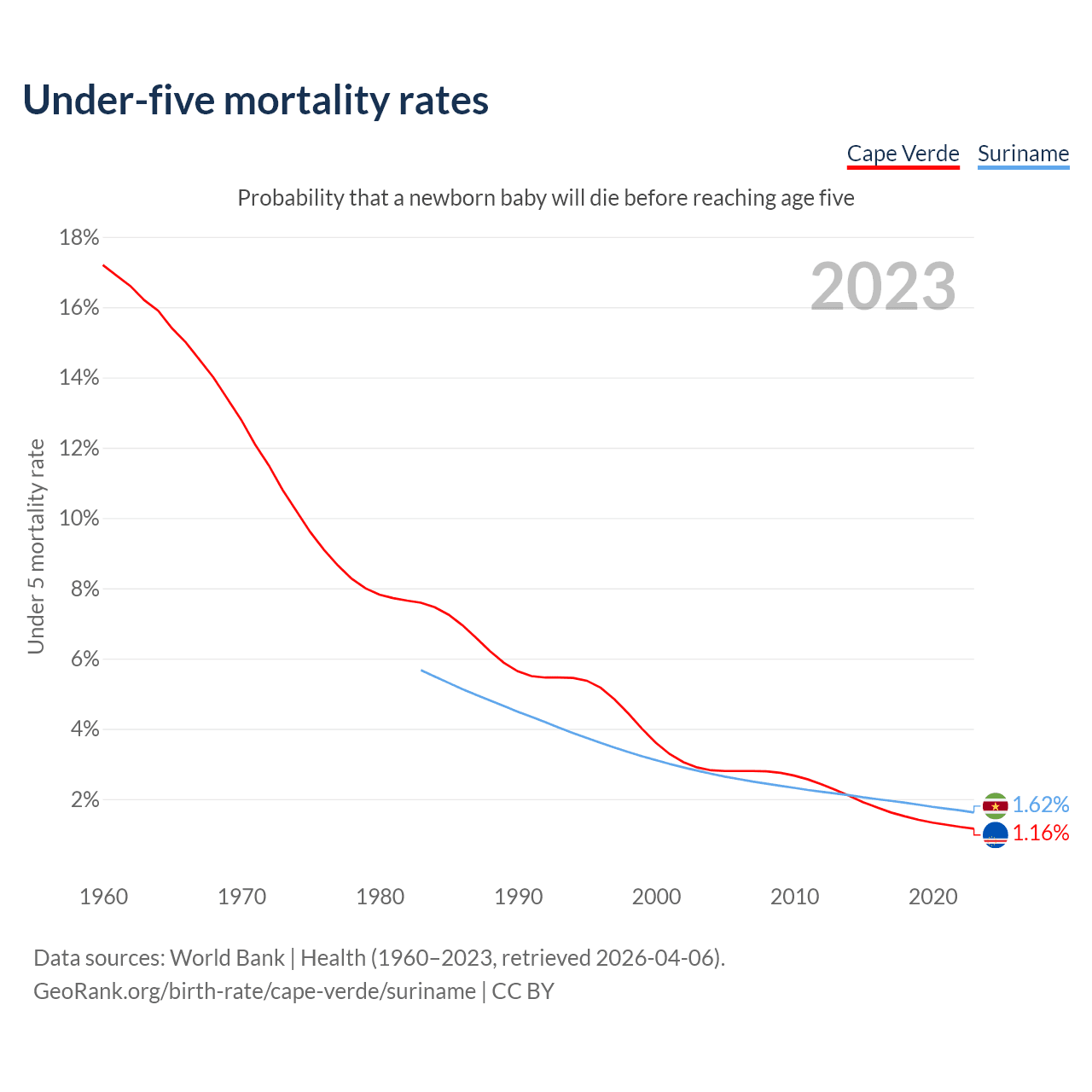 The chance that a newborn baby will die before reaching age five is 1.16% in Cape Verde and 1.62% in Suriname. Above is a chart with historical data on under-five mortality rates.