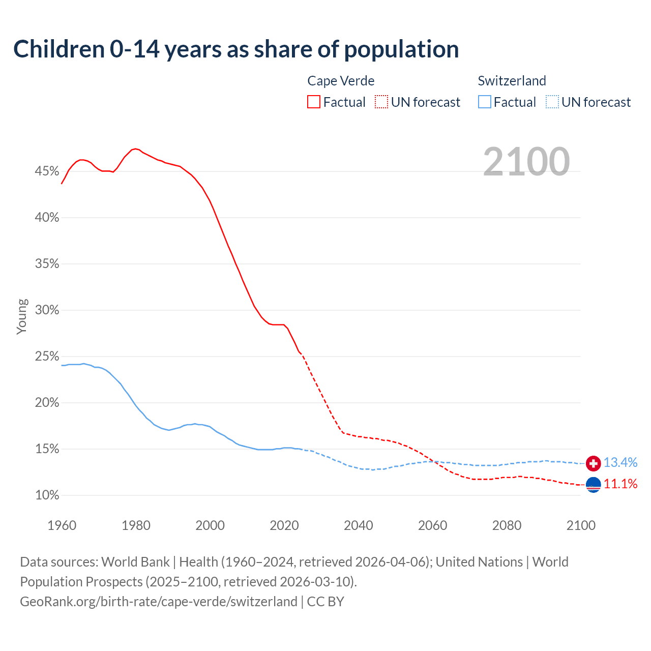 According to the latest available data on birth rates, the fertility rate in Cape Verde was 1.52 children per woman in 2023, compared to 1.33 in Switzerland in 2023. The replacement level is considered to be 2.1 children per woman.