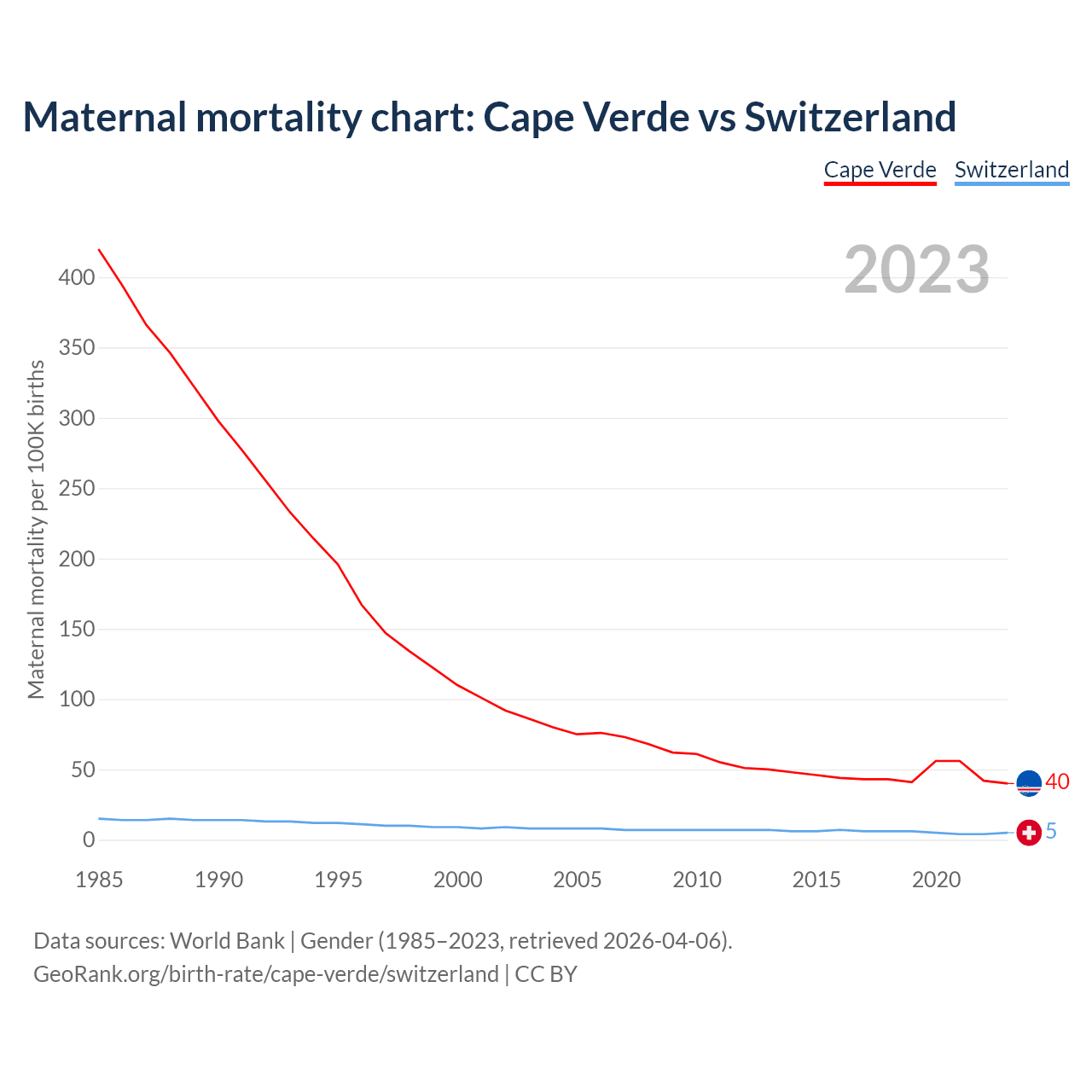 The maternal mortality rate, which is the probability of dying during childbirth or within 42 days of pregnancy termination, is 40 deaths per 100,000 live births in Cape Verde, compared to 5 deaths in Switzerland.