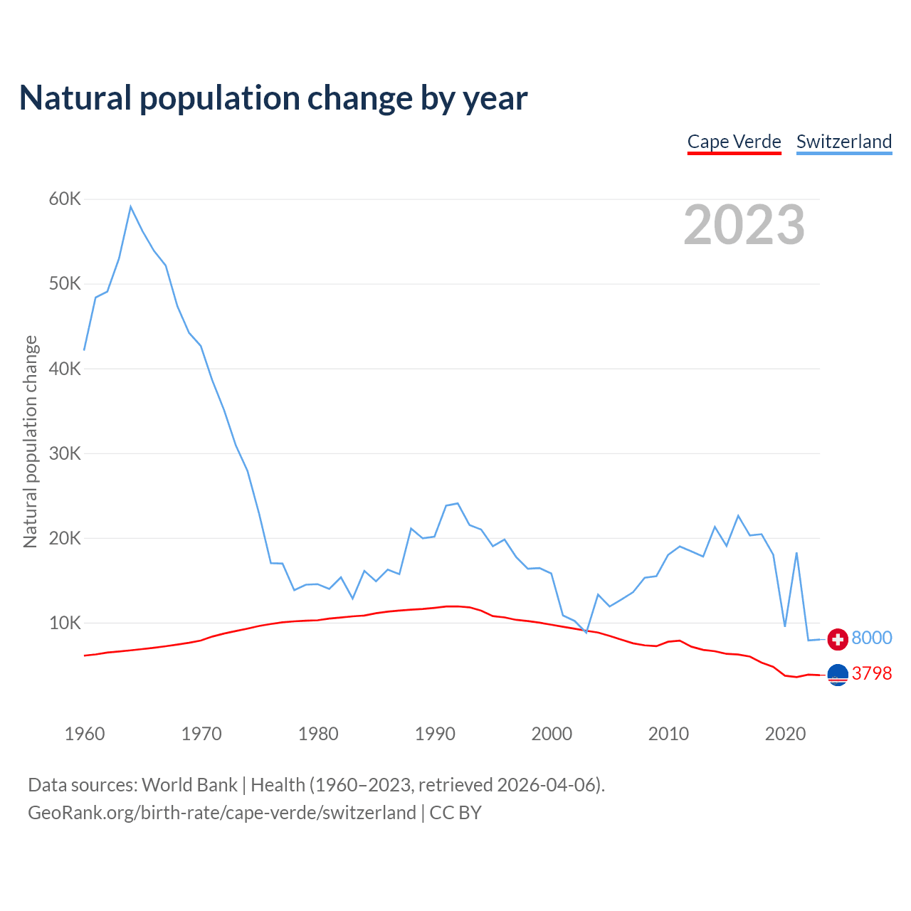 Cape Verde has an annual birth rate of 12.3 births per 1,000 people, compared to 9 for Switzerland. The average number of children a woman is expected to have during her lifetime — the fertility rate, is 1.52 in Cape Verde and 1.33 in Switzerland — 12.6% difference.