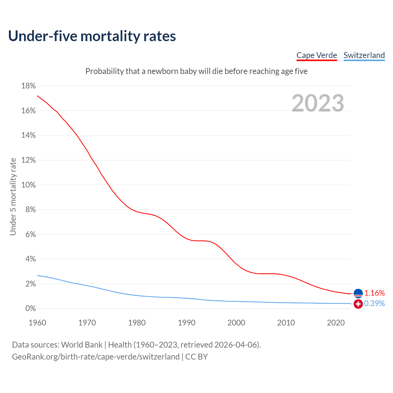 The chance that a newborn baby will die before reaching age five is 1.16% in Cape Verde and 0.39% in Switzerland. Above is a chart with historical data on under-five mortality rates.