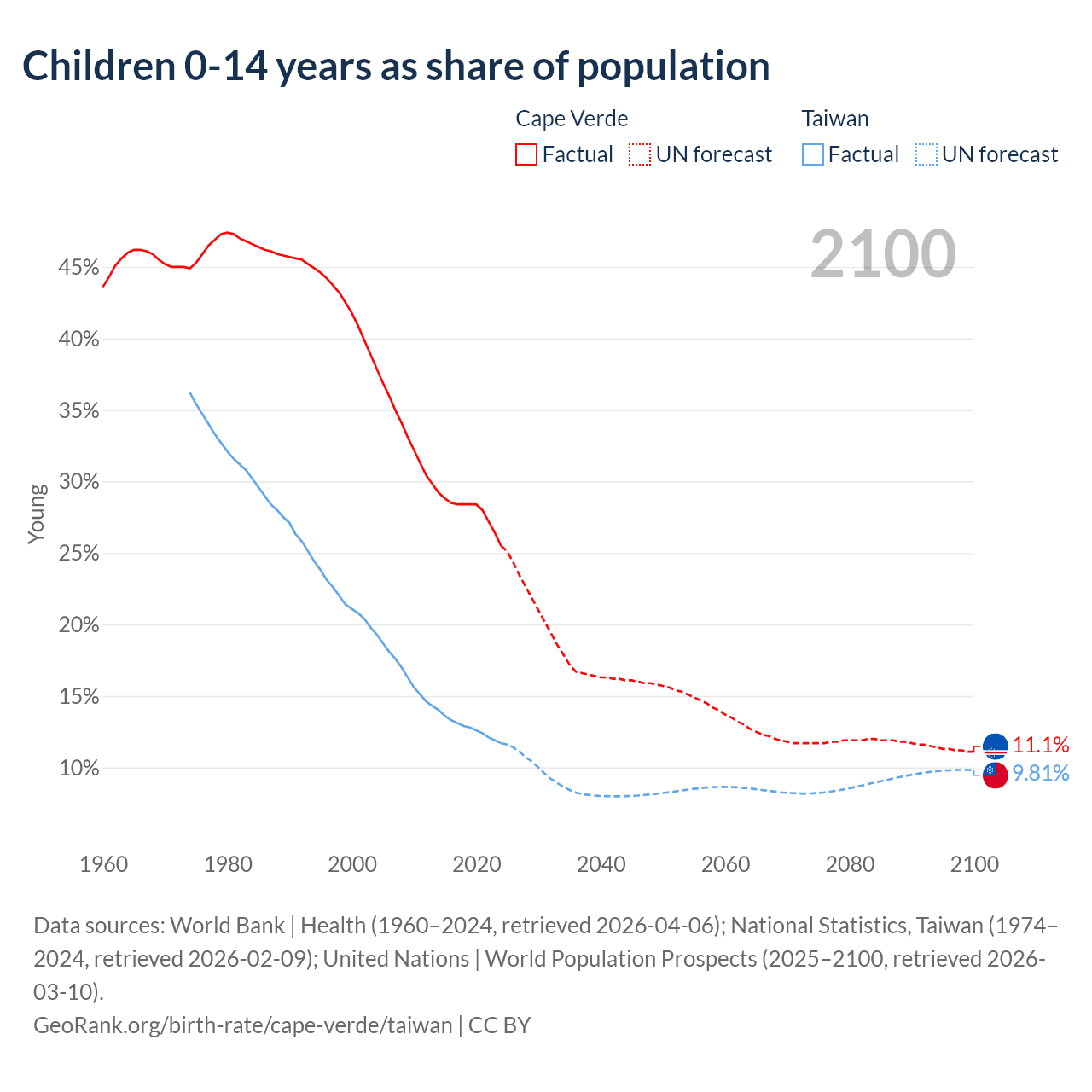 Data sources: World Bank | Health (1960–2024, retrieved 2026-04-06); National Statistics, Taiwan (1974–2024, retrieved 2026-02-09); United Nations | World Population Prospects (2025–2100, retrieved 2026-03-10).
