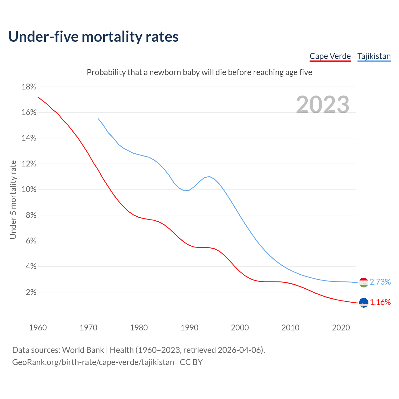 The chance that a newborn baby will die before reaching age five is 1.16% in Cape Verde and 2.73% in Tajikistan. Above is a chart with historical data on under-five mortality rates.