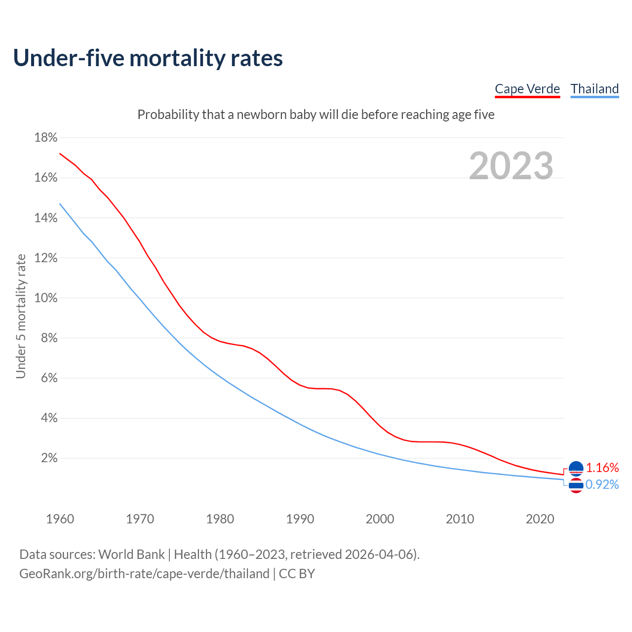 The chance that a newborn baby will die before reaching age five is 1.16% in Cape Verde and 0.92% in Thailand. Above is a chart with historical data on under-five mortality rates.