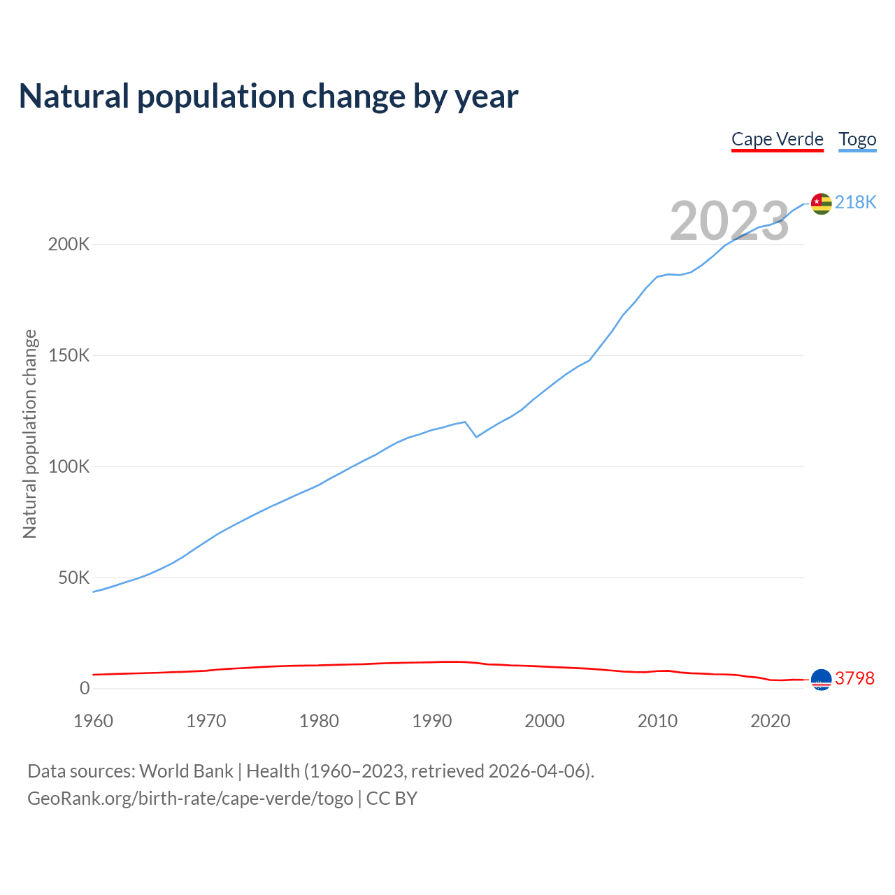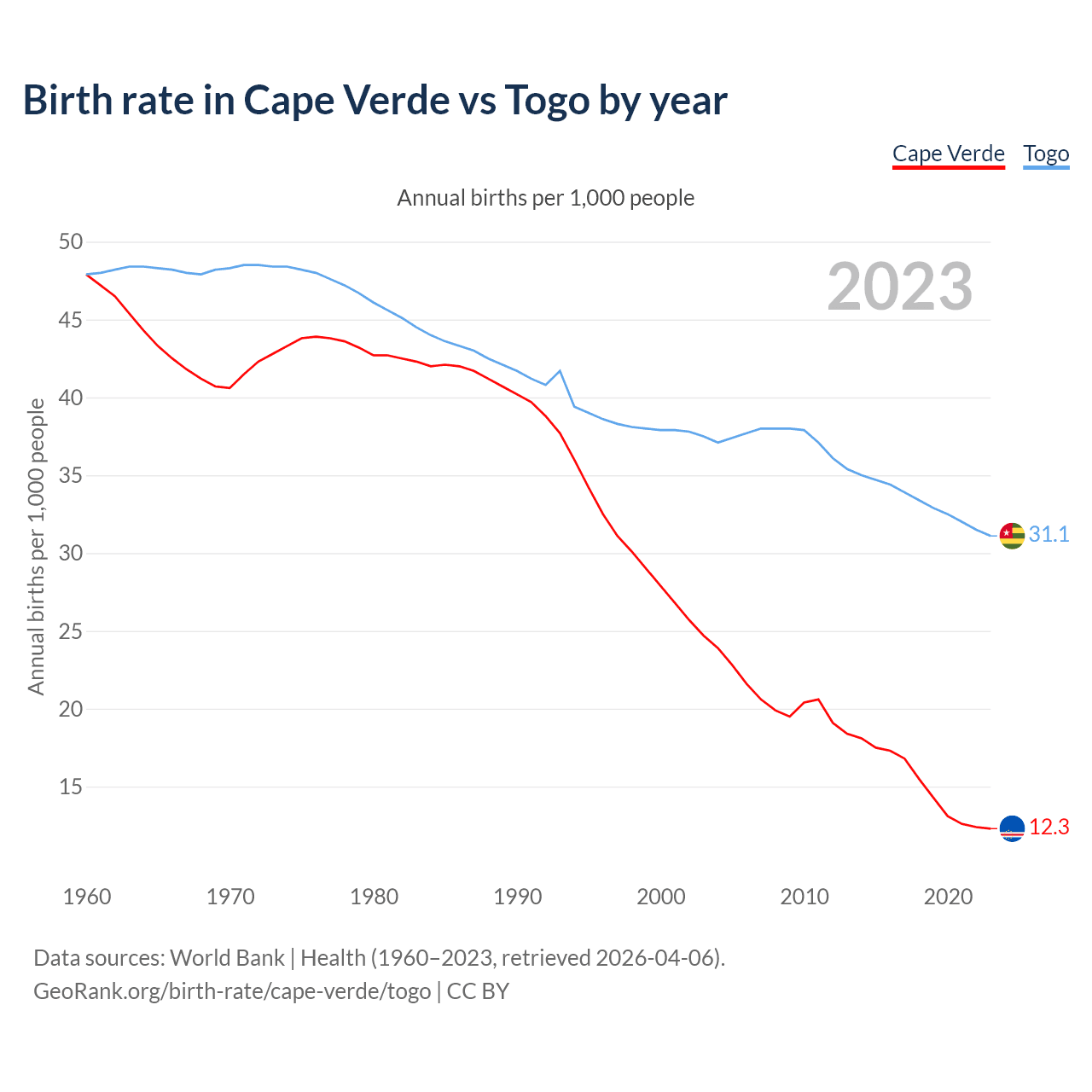 Cape Verde has an annual birth rate of 12.3 births per 1,000 people, compared to 31.1 for Togo. The average number of children a woman is expected to have during her lifetime — the fertility rate, is 1.52 in Cape Verde and 4.19 in Togo — 175.4% difference.