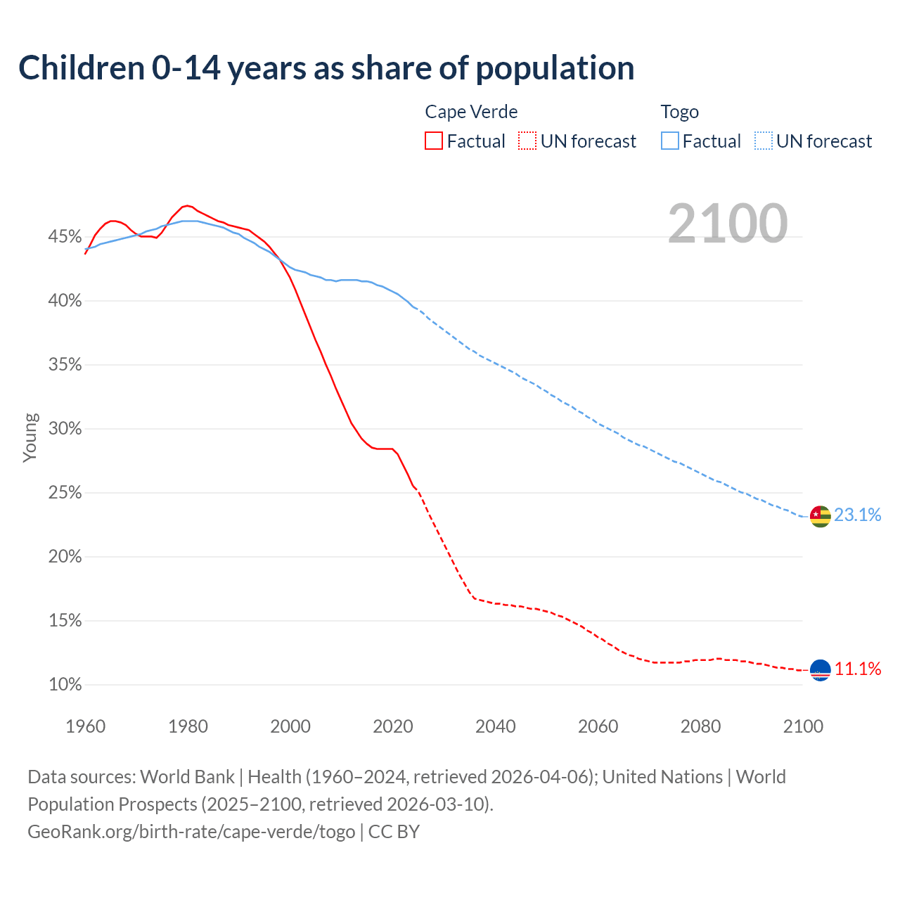 According to the latest available data on birth rates, the fertility rate in Cape Verde was 1.52 children per woman in 2023, compared to 4.19 in Togo in 2023. The replacement level is considered to be 2.1 children per woman.