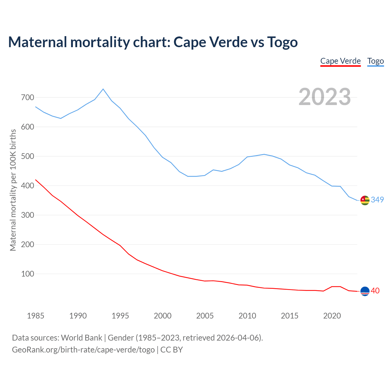 The maternal mortality rate, which is the probability of dying during childbirth or within 42 days of pregnancy termination, is 40 deaths per 100,000 live births in Cape Verde, compared to 349 deaths in Togo.