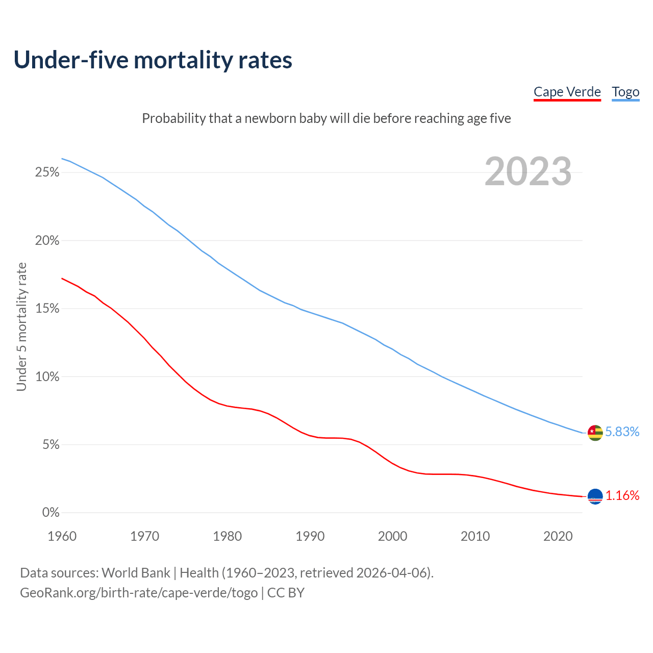 The chance that a newborn baby will die before reaching age five is 1.16% in Cape Verde and 5.83% in Togo. Above is a chart with historical data on under-five mortality rates.
