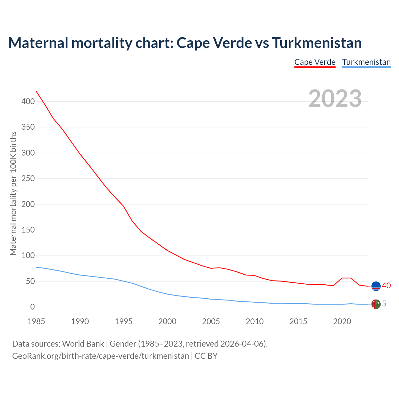 The maternal mortality rate, which is the probability of dying during childbirth or within 42 days of pregnancy termination, is 40 deaths per 100,000 live births in Cape Verde, compared to 5 deaths in Turkmenistan.
