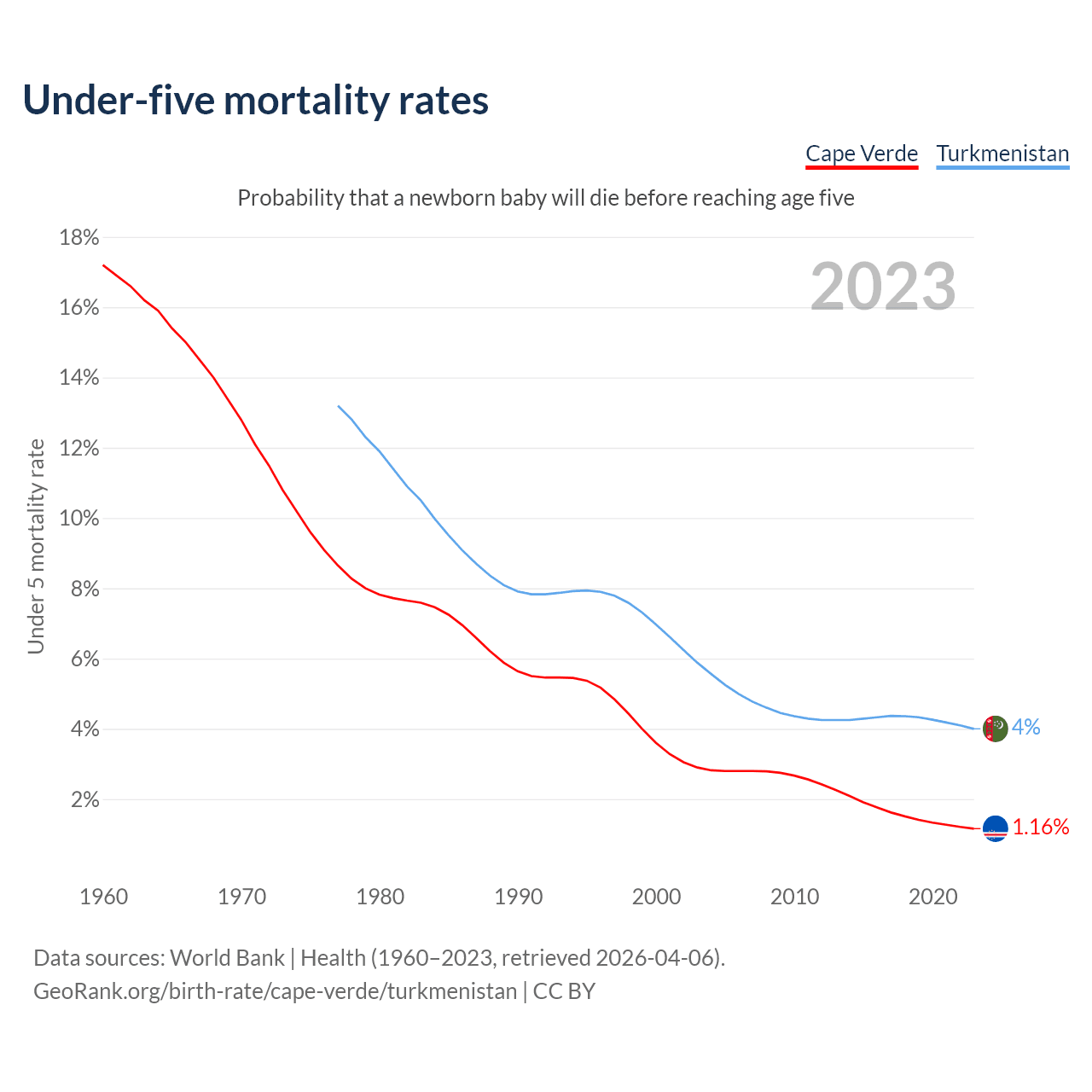 The chance that a newborn baby will die before reaching age five is 1.16% in Cape Verde and 4% in Turkmenistan. Above is a chart with historical data on under-five mortality rates.