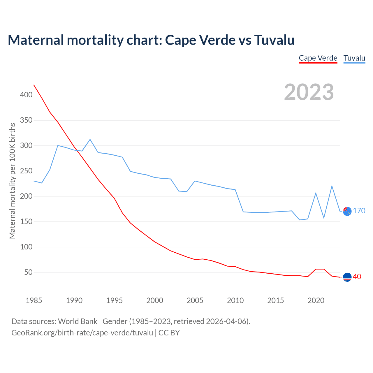 The maternal mortality rate, which is the probability of dying during childbirth or within 42 days of pregnancy termination, is 40 deaths per 100,000 live births in Cape Verde, compared to 170 deaths in Tuvalu.