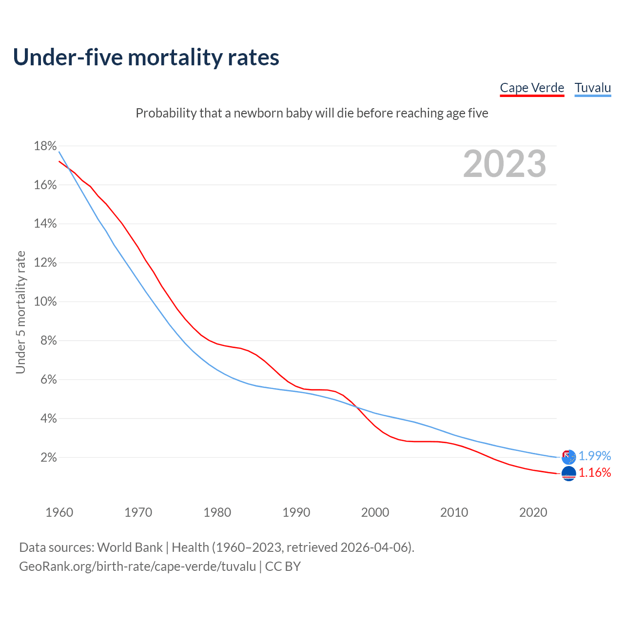 The chance that a newborn baby will die before reaching age five is 1.16% in Cape Verde and 1.99% in Tuvalu. Above is a chart with historical data on under-five mortality rates.