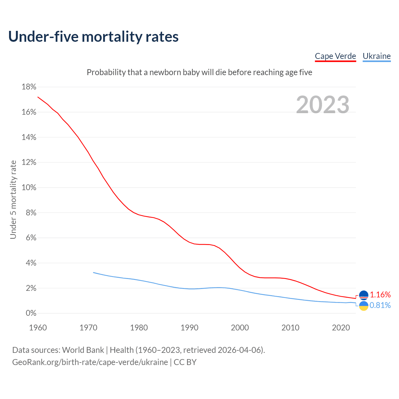 The chance that a newborn baby will die before reaching age five is 1.16% in Cape Verde and 0.81% in Ukraine. Above is a chart with historical data on under-five mortality rates.