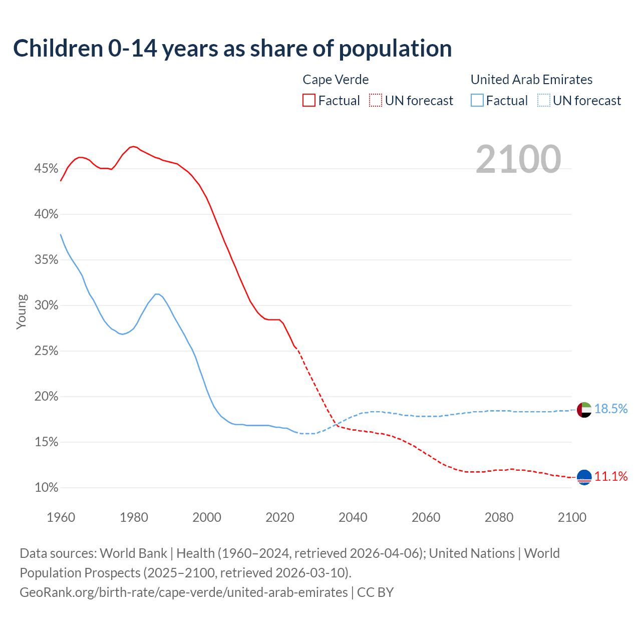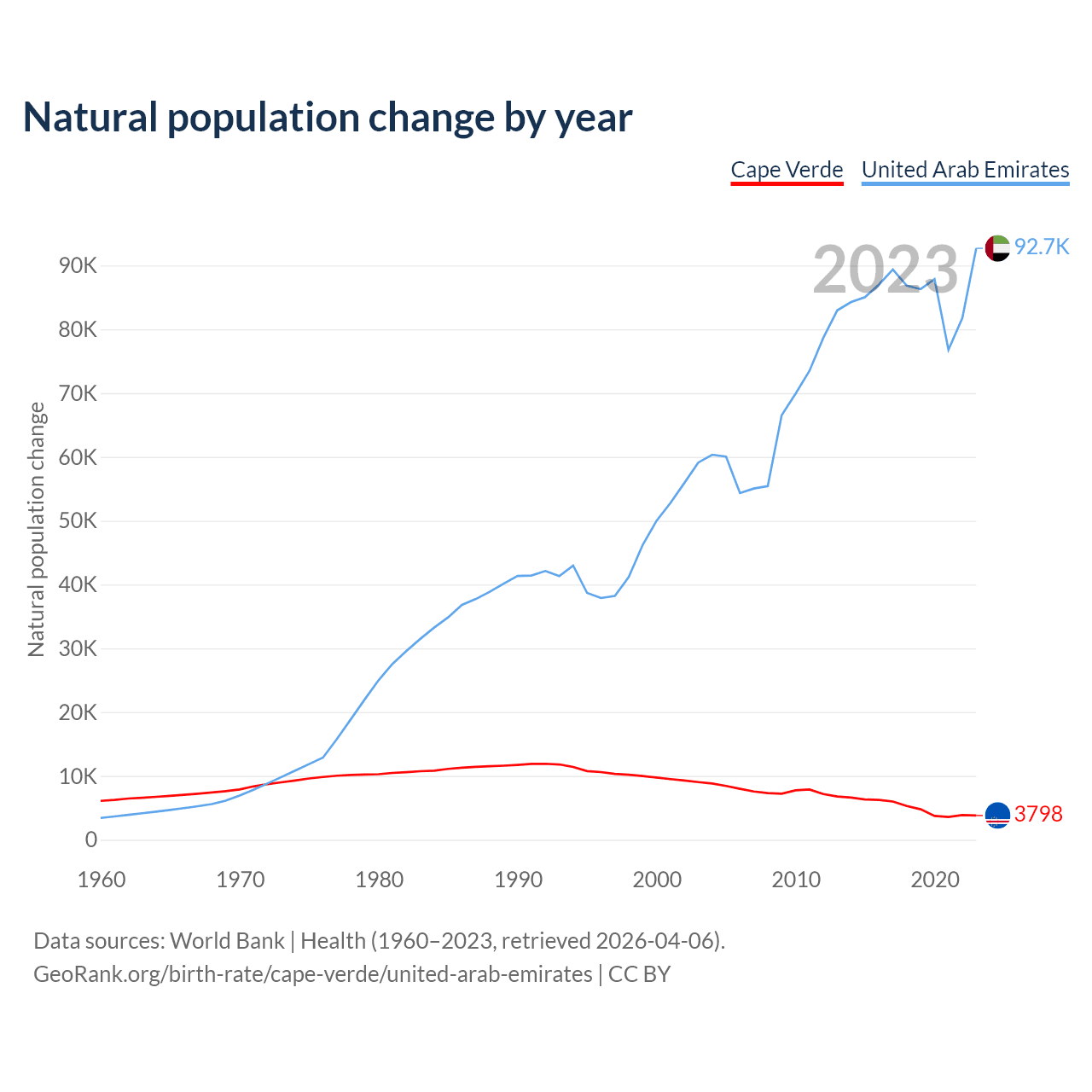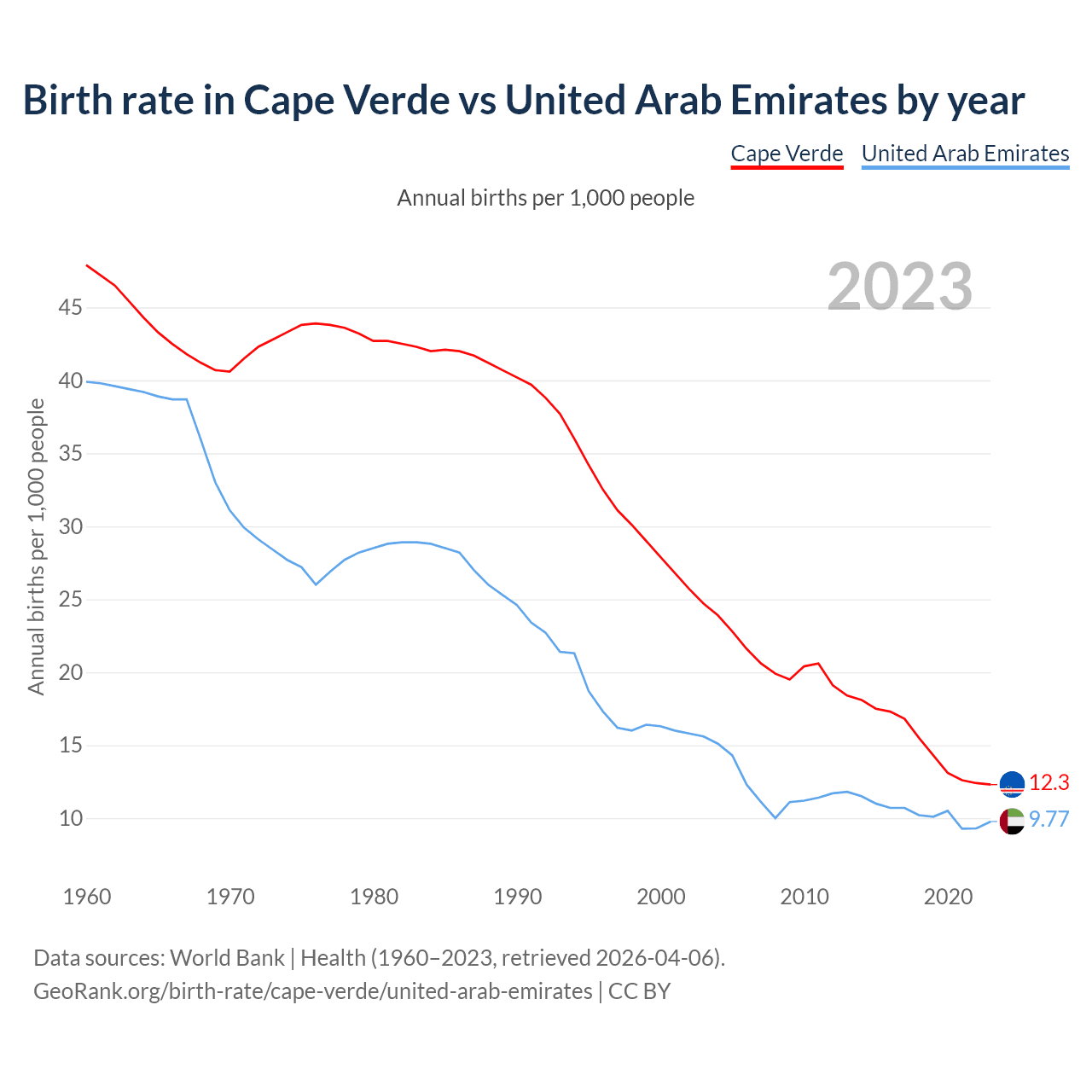 Cape Verde has an annual birth rate of 12.3 births per 1,000 people, compared to 9.77 for the United Arab Emirates. The average number of children a woman is expected to have during her lifetime — the fertility rate, is 1.52 in Cape Verde and 1.2 in the United Arab Emirates — 21.2% difference.