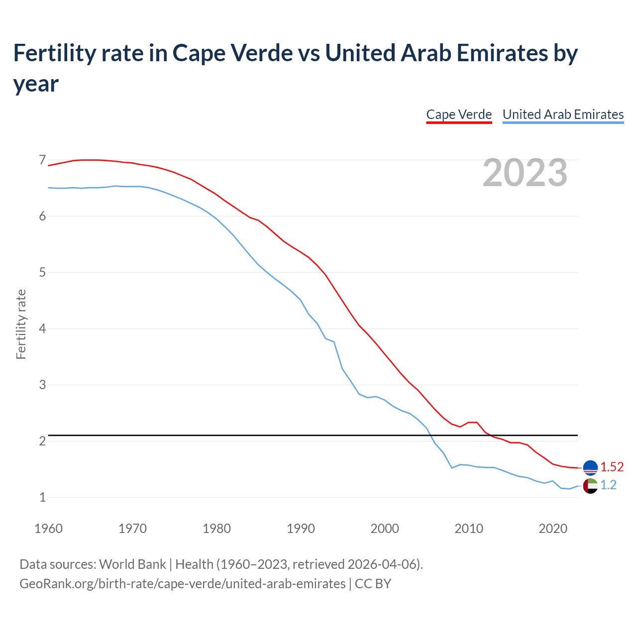 According to the latest available data on birth rates, the fertility rate in Cape Verde was 1.52 children per woman in 2023, compared to 1.2 in the United Arab Emirates in 2023. The replacement level is considered to be 2.1 children per woman.