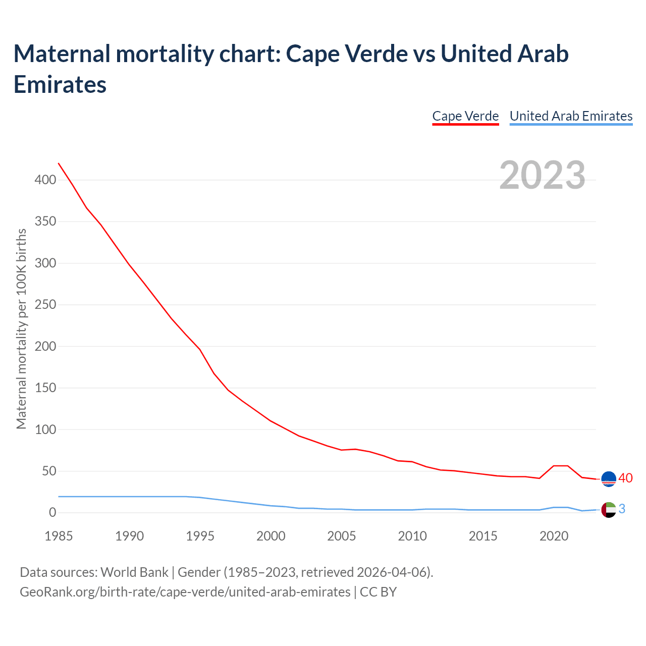 The maternal mortality rate, which is the probability of dying during childbirth or within 42 days of pregnancy termination, is 40 deaths per 100,000 live births in Cape Verde, compared to 3 deaths in the United Arab Emirates.