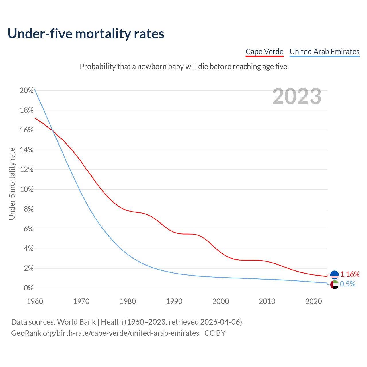 The chance that a newborn baby will die before reaching age five is 1.16% in Cape Verde and 0.5% in the United Arab Emirates. Above is a chart with historical data on under-five mortality rates.