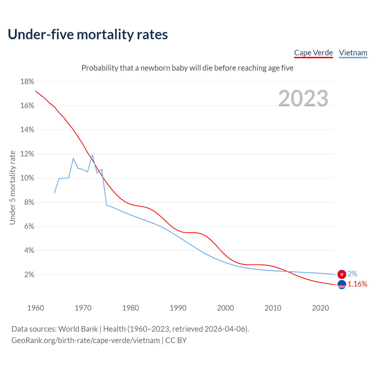 The chance that a newborn baby will die before reaching age five is 1.16% in Cape Verde and 2% in Vietnam. Above is a chart with historical data on under-five mortality rates.