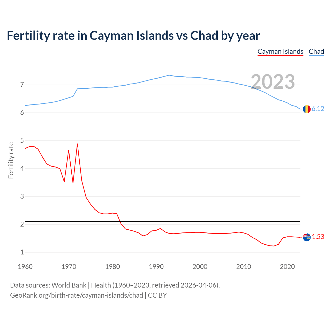 According to the latest available data on birth rates, the fertility rate in the Cayman Islands was 1.53 children per woman in 2023, compared to 6.12 in Chad in 2023. The replacement level is considered to be 2.1 children per woman.